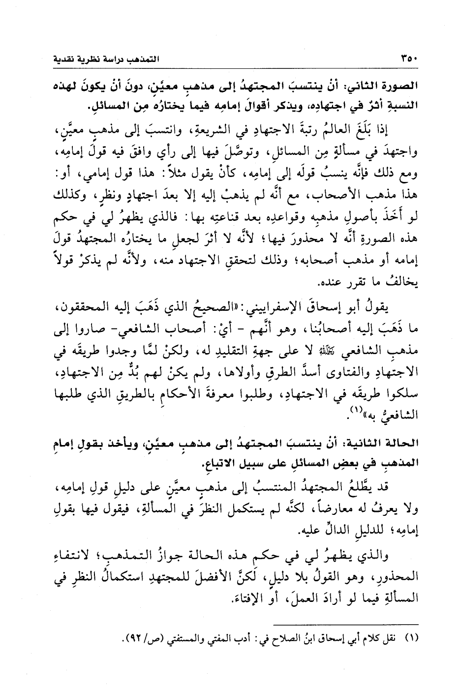 الصورة الثاني: أنْ ينتسبَ المجتهدُ إلى مذهب معيَّنٍ، دونَ أنْ يكونَ لهذه النسبةِ أثرٌ في اجتهادِه، ويذكر أقوالَ إمامِه فيما يختارُه مِن المسائلِ.
