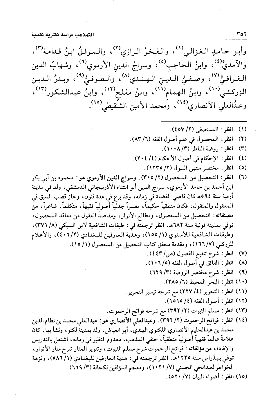 وأبو حامدٍ الغزالي (¬١)، والفخرُ الرازي (¬٢)، والموفقُ بنُ قدامة (¬٣)، والآمديُّ (¬٤)، وابنُ الحاجبِ (¬٥)، وسراجُ الدينِ الأرموي (¬٦)، وشهابُ الدين القرافيُّ (¬٧)، وصفيُّ الدينِ الهندي (¬٨)، والطوفيُّ (¬٩)، وبدرُ الدين الزركشي (¬١٠)، وابنُ الهمامِ (¬١١)، وابنُ مفلحٍ (¬١٢)، وابنُ عبد الشكور (¬١٣)، وعبدُ العلي الأنصاري (¬١٤)، ومحمد الأمين الشنقيطي (¬١٥).