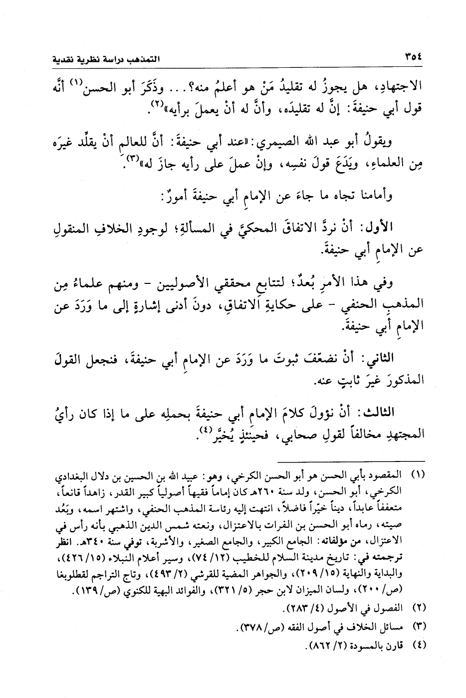 (¬١) المقصود بأبي الحسن هو أبو الحسن الكرخي، وهو: عبيد الله بن الحسين بن دلال البغدادي الكرخي، أبو الحسن، ولد سنة ٢٦٠ هـ كان إمامًا فقيهًا أصوليًا كبير القدر، زاهدًا قانعًا، متعففًا عابدًا، دينًا خيّرًا فاضلًا، انتهت إليه رئاسة المذهب الحنفي، واشتهر اسمه، وبَعُد صيته، رماه أبو الحسن بن الفرات بالاعتزال، ونعته شمس الدين الذهبي بأنه رأس في الاعتزال، من مؤلفاته: الجامع الكبير، والجامع الصغير، والأشربة، توفي سنة ٣٤٠ هـ. انظر ترجمته في: تاريخ مدينة السلام للخطيب (١٢/ ٧٤)، وسير أعلام النبلاء (١٥/ ٤٢٦)، والبداية والنهاية (١٥/ ٢٠٩)، والجواهر المضية للقرشي (٢/ ٤٩٣)، وتاج التراجم لقطلوبغا (ص / ٢٠٠)، ولسان الميزان لابن حجر (٥/ ٣٢١)، والفوائد البهية للكنوي (ص/ ١٣٩).