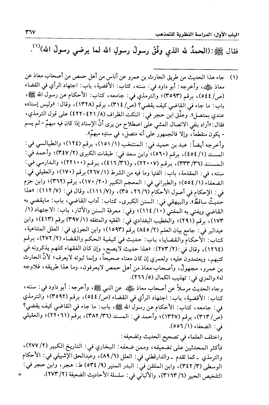 (¬١) جاء هذا الحديث من طريق الحارث بن عمرو عن أناس من أهل حمص من أصحاب معاذ عن معاذ - رضي الله عنه -، وأخرجه: أبو داود في: سننه، كتاب: الأقضية، باب: اجتهاد الرأي في القضاء (ص/ ٥٤٤)، برقم (٣٥٩٣)؛ والترمذي في: جامعه، كتاب: الأحكام عن رسول الله - صلي الله عليه وسلم -، باب: ما جاء في القاضي كيف يقضي؟ (ص / ٣١٤)، برقم (١٣٢٨)، وقال: "وليس إسناده عندي بمتصل". وعلَّق ابن حجر في: النكت الظراف (٨/ ٤٢١ - ٤٢٢) على قول الترمذي، فقال: "أراد بنفي الاتصال المشي على اصطلاح من يرى أنَّ الإسناد إذا كان فيه مبهمٌ - لم يسم - يكون منقطعًا، وإلا فالجمهور على أنه متصل، في سندِه مبهمٌ".