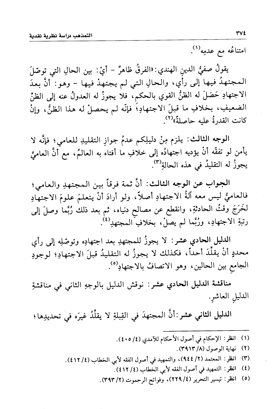 الجواب عن الوجه الثالث: أنَّ ثمة فرقًا بين المجتهدِ والعامي؛ فالعاميُّ ليس معه آلةُ الاجتهادِ أصلًا، ولو أرادَ أنْ يتعلمَ علومَ الاجتهادِ لخَرَجَ وقتُ الحادثةِ، وانقطع عن مصالحِ دنياه، ثم بعد ذلك رُبَّما وصلَ إلى رتبةِ الاجتهادِ، ورُبَّما لم يصلْ، بخلافِ المجتهدِ (¬٤).