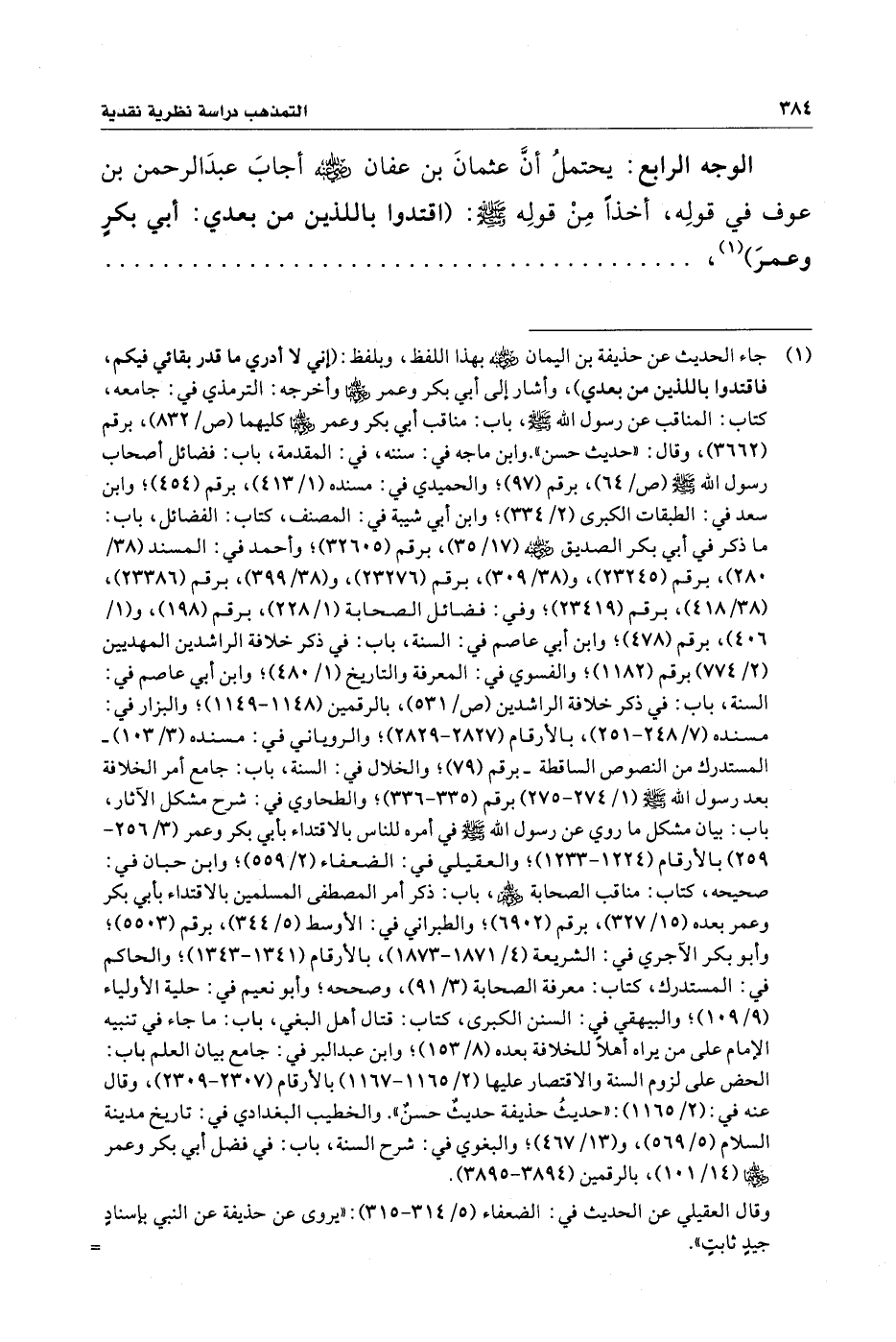 (¬١) جاء الحديث عن حذيفة بن اليمان - رضي الله عنه - بهذا اللفظ، وبلفظ: (إني لا أدري ما قدر بقائي فيكم، فاقتدوا باللذين من بعدي)، وأشار إلى أبي بكر وعمر - رضي الله عنهما - وأخرجه: الترمذي في: جامعه، كتاب: المناقب عن رسول الله - صلي الله عليه وسلم -، باب: مناقب أبي بكر وعمر - رضي الله عنهما - كليهما (ص/ ٨٣٢)، برقم (٣٦٦٢)، وقال: "حديث حسن". وابن ماجه في: سننه، في: المقدمة، باب: فضائل أصحاب رسول الله - صلى الله عليه وسلم - (ص/ ٦٤)، برقم (٩٧)؛ والحميدي في: مسنده (١/ ٤١٣)، برقم (٤٥٤)؛ وابن سعد في: الطبقات الكبرى (٢/ ٣٣٤)؛ وابن أبي شيبة في: المصنف، كتاب: الفضائل، باب: ما ذكر في أبي بكر الصديق - رضي الله عنه - (١٧/ ٣٥)، برقم (٣٢٦٠٥)؛ وأحمد في: المسند (٣٨/ ٢٨٠)، برقم (٢٣٢٤٥)، و (٣٨/ ٣٠٩)، برقم (٢٣٢٧٦)، و (٣٨/ ٣٩٩)، برقم (٢٣٣٨٦)، (٣٨/ ٤١٨)، برقم (٢٣٤١٩)؛ وفي: فضائل الصحابة (١/ ٢٢٨)، برقم (١٩٨)، و (١/ ٤٠٦)، برقم (٤٧٨)؛ وابن أبي عاصم في: السنة، باب: في ذكر خلافة الراشدين المهديين (٢/ ٧٧٤) برقم (١١٨٢)؛ والفسوي في: المعرفة والتاريخ (١/ ٤٨٠)؛ وابن أبي عاصم في: السنة، باب: في ذكر خلافة الراشدين (ص/ ٥٣١)، بالرقمين (١١٤٨ - ١١٤٩)؛ والبزار في: مسنده (٧/ ٢٤٨ - ٢٥١)، بالأرقام (٢٨٢٧ - ٢٨٢٩)؛ والروياني في: مسنده (٣/ ١٠٣) - المستدرك من النصوص الساقطة - برقم (٧٩)؛ والخلال في: السنة، باب: جامع أمر الخلافة بعد رسول الله - صلي الله عليه وسلم - (١/ ٢٧٤ - ٢٧٥) برقم (٣٣٥ - ٣٣٦)؛ والطحاوي في: شرح مشكل الآثار، باب: بيان مشكل ما روي عن رسول الله - صلي الله عليه وسلم - في أمره للناس بالاقتداء بأبي بكر وعمر (٣/ ٢٥٦ - ٢٥٩) بالأرقام (١٢٢٤ - ١٢٣٣)؛ والعقيلي في: الضعفاء (٢/ ٥٥٩)؛ وابن حبان في: صحيحه، كتاب: مناقب الصحابة - رضي الله عنه -، باب: ذكر أمر المصطفى المسلمين بالاقتداء بأبي بكر وعمر بعده (١٥/ ٣٢٧)، برقم (٦٩٠٢)؛ والطبراني في: الأوسط (٥/ ٣٤٤)، برقم (٥٥٠٣)؛ وأبو بكر الآجري في: الشريعة (٤/ ١٨٧١ - ١٨٧٣)، بالأرقام (١٣٤١ - ١٣٤٣)؛ والحاكم في: المستدرك، كتاب: معرفة الصحابة (٣/ ٩١)، وصححه؛ وأبو نعيم في: حلية الأولياء (٩/ ١٠٩)؛ والبيهقي في: السنن الكبرى، كتاب: قتال أهل البغي، باب: ما جاء في تنبيه الإمام على من يراه أهلًا للخلافة بعده (٨/ ١٥٣)؛ وابن عبد البر في: جامع بيان العلم باب: الحض على لزوم السنة والاقتصار عليها (٢/ ١١٦٥ - ١١٦٧) بالأرقام (٢٣٠٧ - ٢٣٠٩)، وقال عنه في: (٢/ ١١٦٥): "حديثُ حذيفة حديثٌ حسنٌ". والخطيب البغدادي في: تاريخ مدينة السلام (٥/ ٥٦٩)، و (١٣/ ٤٦٧)؛ والبغوي في: شرح السنة، باب: في فضل أبي بكر وعمر - رضي الله عنهما - (١٤/ ١٠١)، بالرقمين (٣٨٩٤ - ٣٨٩٥).