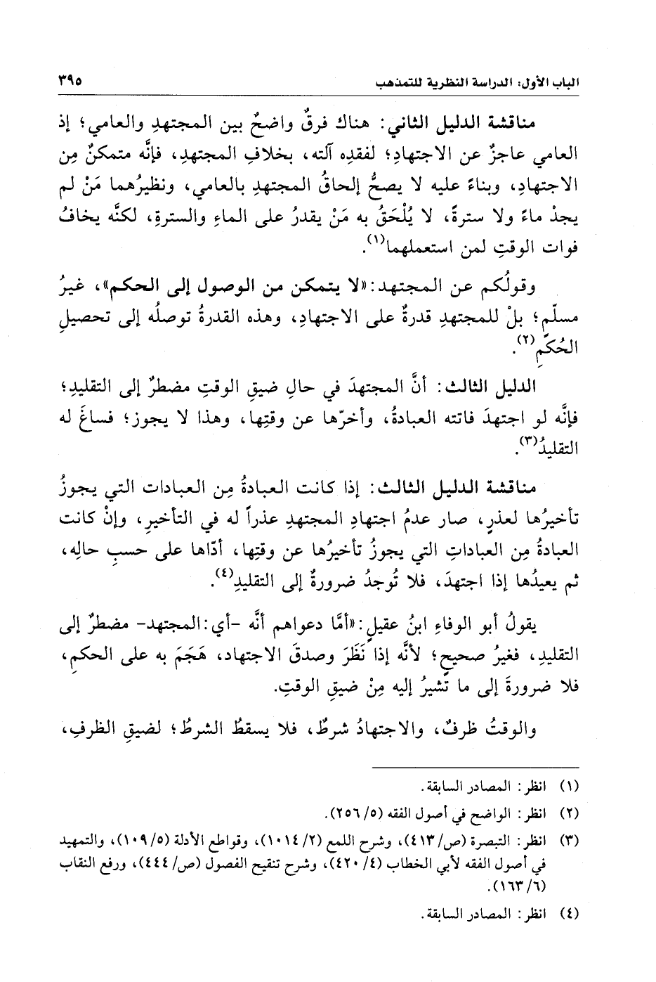 مناقشة الدليل الثالث: إذا كانت العبادةُ مِن العبادات التي يجوزُ تأخيرُها لعذرٍ، صار عدمُ اجتهادِ المجتهدِ عذرًا له في التأخيرِ، وإنْ كانت العبادةُ مِن العباداتِ التي يجوزُ تأخيرُها عن وقتِها، أدّاها على حسب حالِه، ثم يعيدُها إذا اجتهدَ، فلا تُوجدُ ضرورةٌ إلى التقليدِ (¬٤).