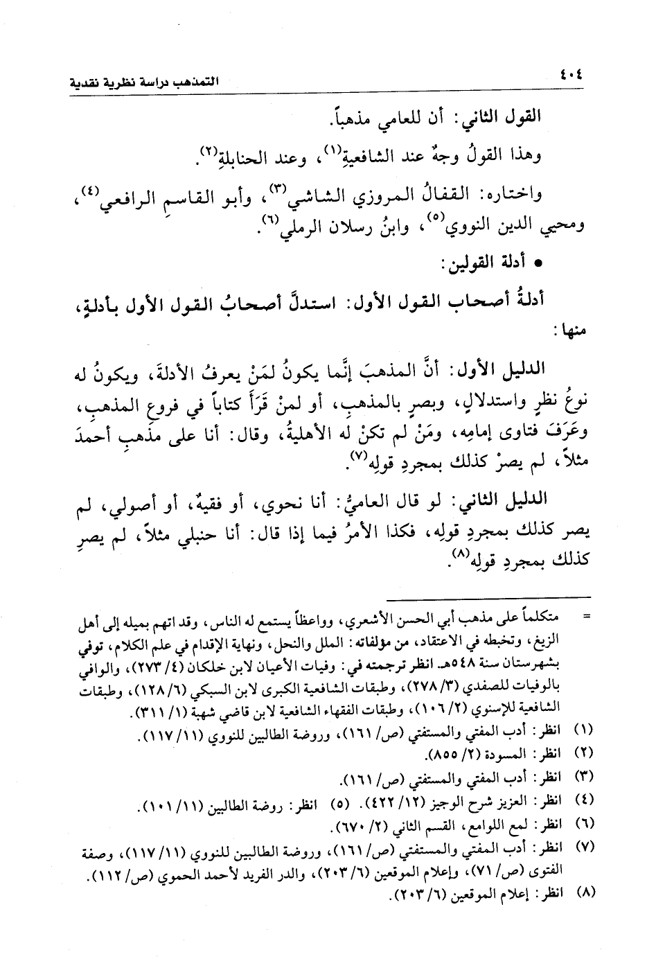 الدليل الثاني: لو قال العاميُّ: أنا نحوي، أو فقيهٌ، أو أصولي، لم يصر كذلك بمجردِ قولِه، فكذا الأمرُ فيما إذا قال: أنا حنبلي مثلًا، لم يصرِ كذلك بمجردِ قولِه (¬٨).