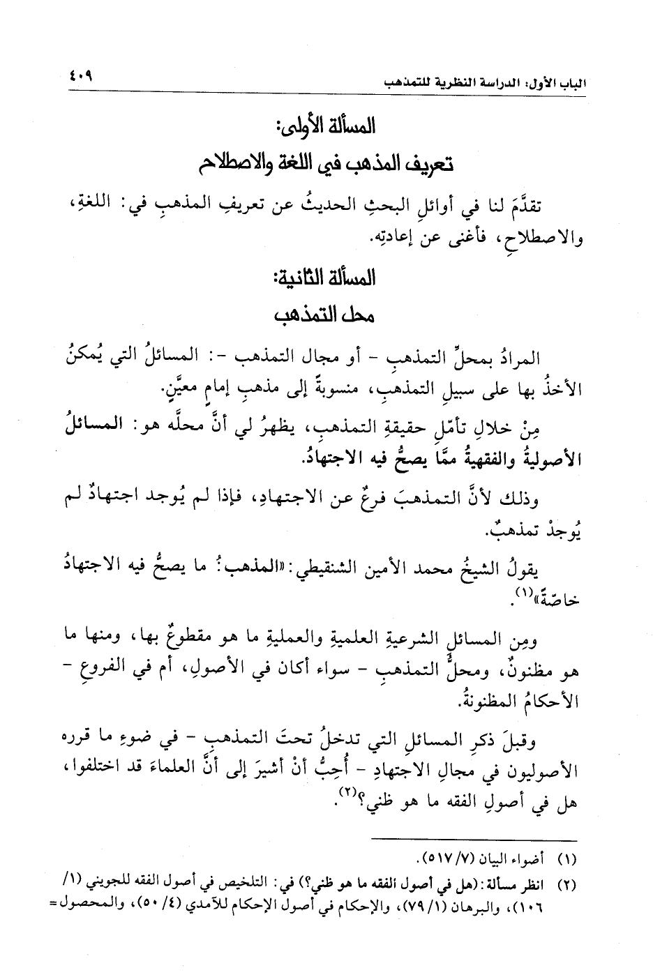 يقولُ الشيخُ محمد الأمين الشنقيطي: "المذهبُ: ما يصحُّ فيه الاجتهادُ خاصّةً" (¬١).