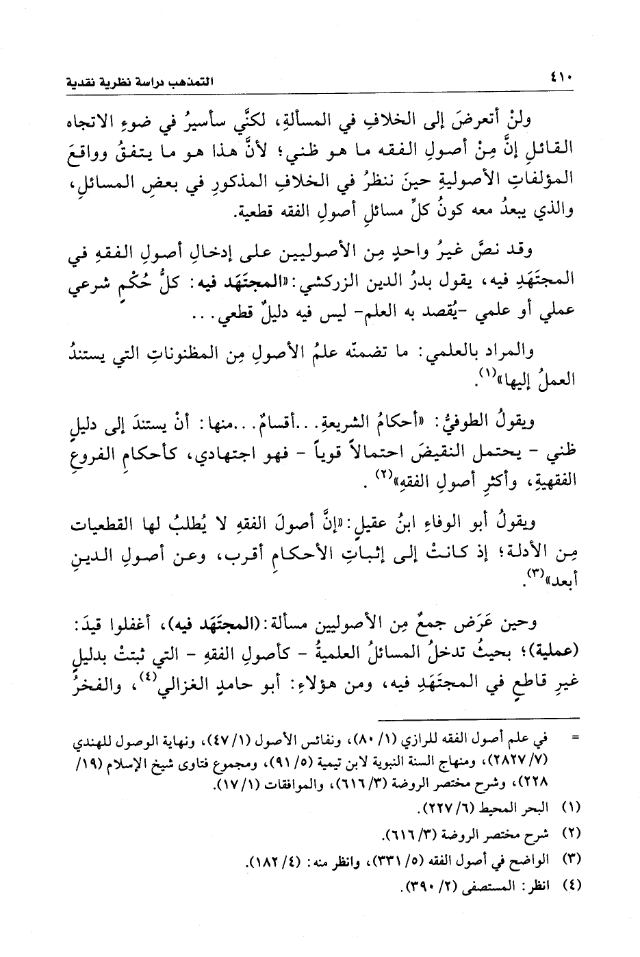 ويقولُ الطوفيُّ: "أحكامُ الشريعةِ ... أقسامٌ ... منها: أنْ يستندَ إلى دليلٍ ظني - يحتمل النقيضَ احتمالًا قويًا - فهو اجتهادي، كأحكامِ الفروعِ الفقهيةِ، وأكثرِ أصولِ الفقهِ" (¬٢).