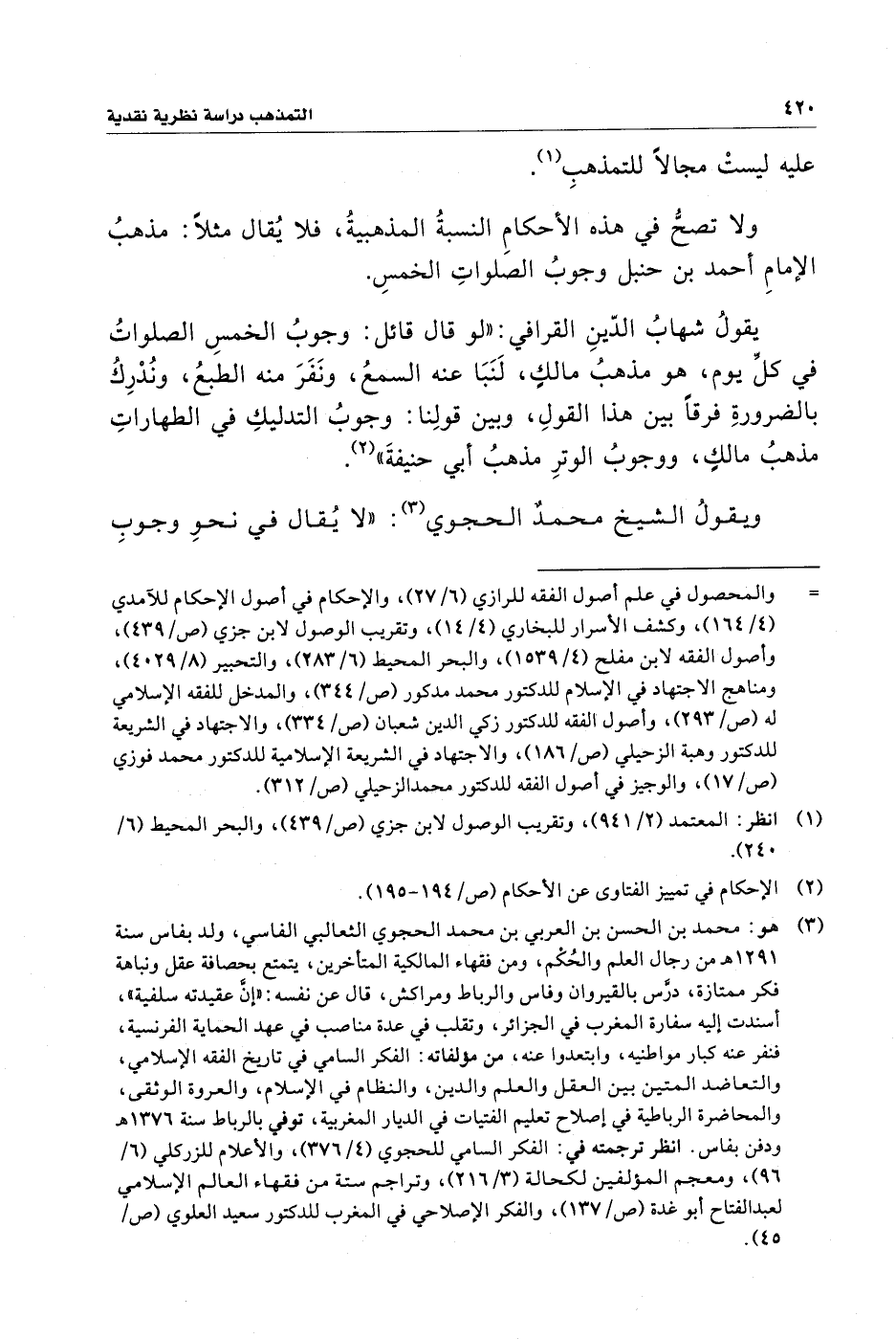 ولا تصحُّ في هذه الأحكامِ النسبةُ المذهبيةُ، فلا يُقال مثلًا: مذهبُ الإمامِ أحمد بن حنبل وجوبُ الصلواتِ الخمسِ.