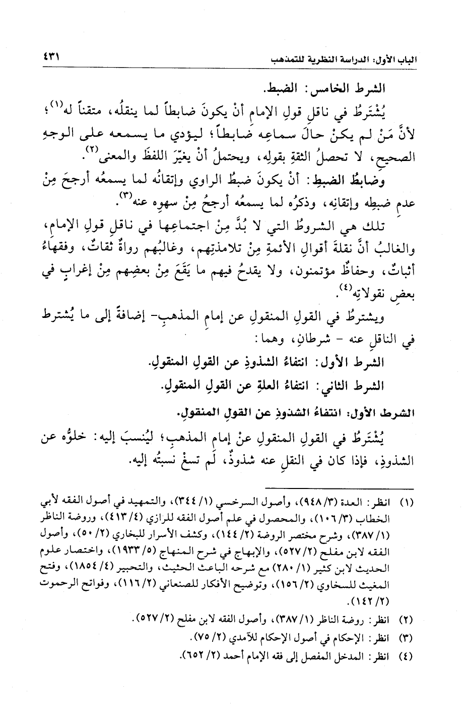 يُشْتَرطُ في القولِ المنقولِ عنْ إمامِ المذهبِ؛ ليُنسبَ إليه: خلوُّه عن الشذوذِ، فإذا كان في النقلِ عنه شذوذٌ، لم تسغْ نسبتُه إليه.