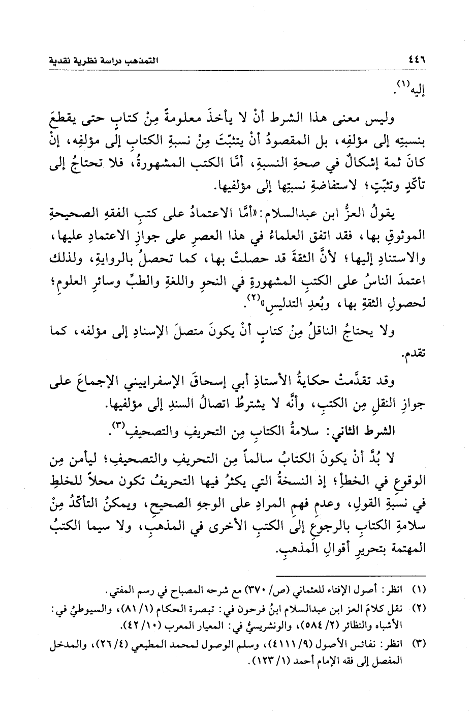 وليس معنى هذا الشرط أنْ لا يأخذَ معلومةً مِنْ كتابٍ حتى يقطعَ بنسبتِه إلى مؤلفِه، بل المقصودُ أنْ يتثبّتَ مِنْ نسبةِ الكتاب إلى مؤلفِه، إنْ كانَ ثمة إشكالٌ في صحةِ النسبةِ، أمَّا الكتب المشهورةُ، فلا تحتاجُ إلى تأكّدٍ وتثبّتٍ؛ لاستفاضةِ نسبتِها إلى مؤلفيها.