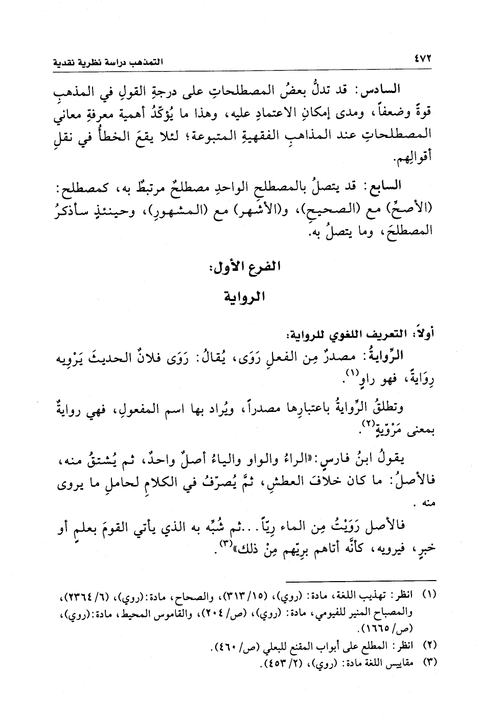 (¬١) انظر: تهذيب اللغة، مادة (روي)، (١٥/ ٣١٣)، والصحاح، مادة: (روي)، (٦/ ٢٣٦٤)، والمصباح المنير للفيومي، مادة: (روي)، (ص/ ٢٠٤)، والقاموس المحيط، مادة: (روي)، (ص/ ١٦٦٥).