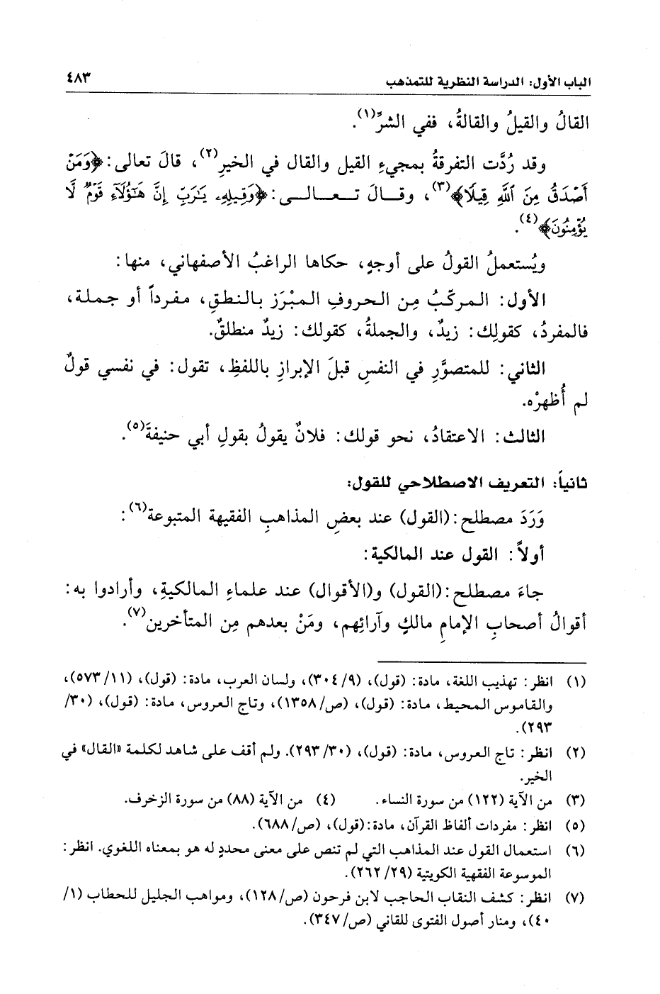 (¬٦) استعمال القول عند المذاهب التي لم تنص على معنى محددٍ له هو بمعناه اللغوي. انظر: الموسوعة الفقهية الكويتية (٢٩/ ٢٦٢).