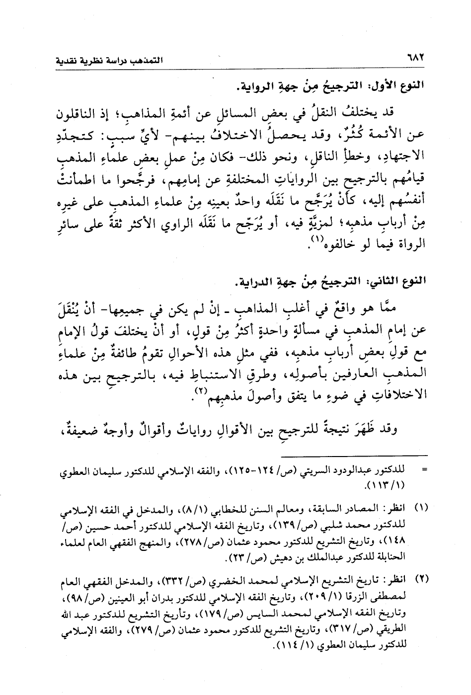 ممَّا هو واقعٌ في أغلب المذاهبِ - إنْ لم يكن في جميعِها - أنْ يُنْقَلَ عن إمامِ المذهب في مسألةٍ وَاحدةٍ أكثرُ مِنْ قولٍ، أو أنْ يختلفَ قولُ الإمامِ مع قولِ بعضِ أرَبابِ مذهبِه، ففي مثلِ هذه الأحوالِ تقومُ طائفةٌ مِنْ علماءِ المذهب العارفين بأصولِه، وطرقِ الاستنباطِ فيه، بالترجيحِ بين هذه الاختلافَاتِ في ضوءِ ما يتفق وأصولَ مذهبِهم (¬٢).