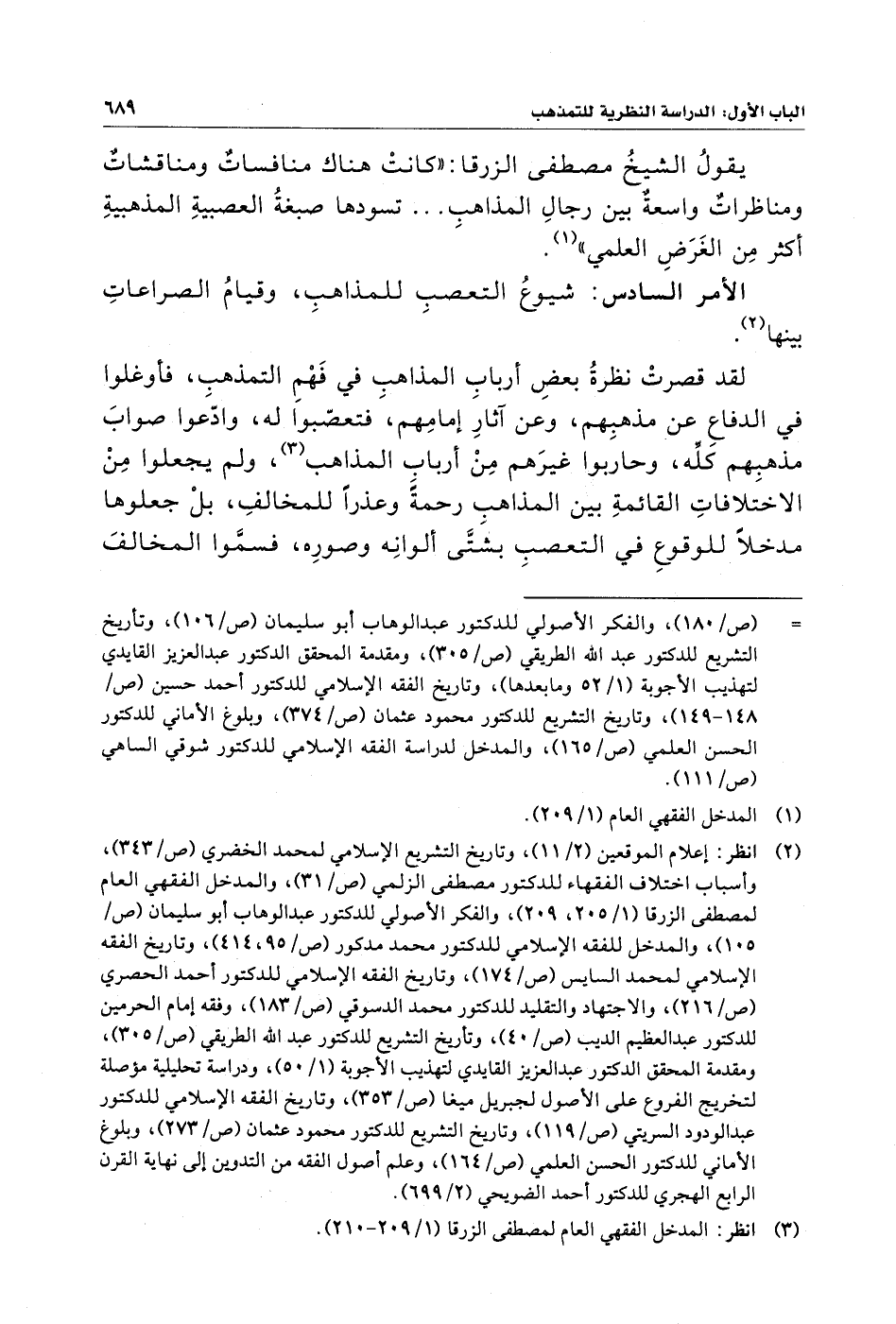 يقولُ الشيخُ مصطفى الزرقا: "كانتْ هناك منافساتٌ ومناقشاتٌ ومناظراتٌ واسعةٌ بين رجالِ المذاهب ... تسودها صبغةُ العصبيةِ المذهبيةِ أكثر مِن الغَرَضِ العلمي" (¬١).