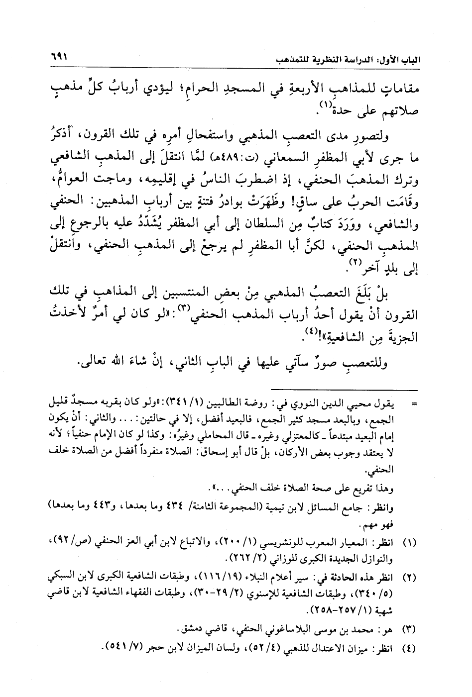 ولتصورِ مدى التعصب المذهبي واستفحالِ أمرِه في تلك القرون، أذكرُ ما جرى لأبي المظفرِ السمَعاني (ت: ٤٨٩ هـ) لمَّا انتقلَ إلى المذهبِ الشافعي وترك المذهبَ الحنفي، إذ اضطربَ الناسُ في إقليمِه، وماجت العوامُّ، وقَامَت الحربُ على ساقٍ! وظَهَرَتْ بوادرُ فتنةٍ بين أرباب المذهبين: الحنفي والشافعي، ووَرَدَ كتابٌ مِن السلطان إلى أبي المظفر يُشَدّدُ عليه بالرجوعِ إلى المذهبِ الحنفي، لكنَّ أبا المظفرِ لم يرجعْ إلى المذهبِ الحنفي، وانتقلْ إلى بلدٍ آخر (¬٢).