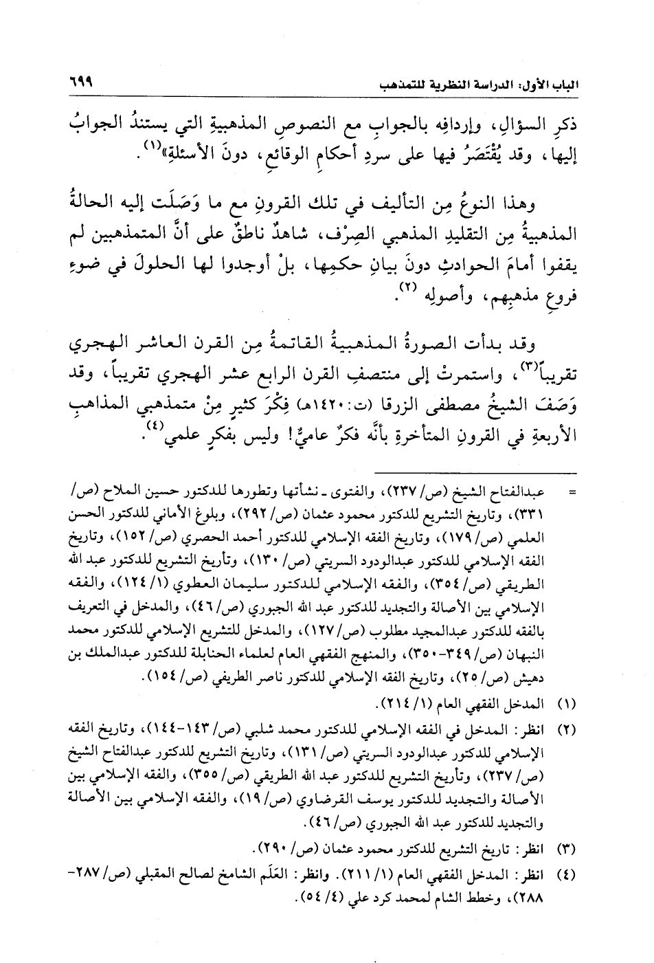 وقد بدأت الصورةُ المذهبيةُ القاتمةُ مِن القرن العاشر الهجري تقريبًا (¬٣)، واستمرتْ إلى منتصفِ القرن الرابع عشر الهجري تقريبًا، وقد وَصفَ الشيخُ مصطفى الزرقا (ت: ١٤٢٠ هـ) فِكْرَ كثيرٍ مِن متمذهبي المذاهبِ الأربعةِ في القرونِ المتأخرةِ بأنَّه فكرٌ عاميٌّ! وليس بفكرٍ علمي (¬٤).