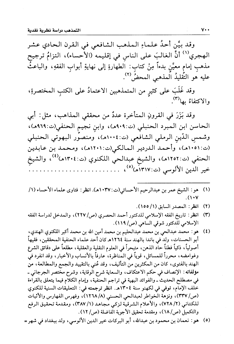 وقد بيَّن أحدُ علماءِ المذهب الشافعي في القرن الحادي عشر الهجري (¬١) أنَّ الغالبَ على الناسِ في إقليمه (الأحساء)، التزامُ ترجيح مذهبِ إمامٍ معيَّنٍ بدءًا مِنْ كتاب: الطهارةِ إلى نهايةِ أبوابِ الفقهِ، والباعثُ عليه هو التقليدُ المذهبي المحضُ (¬٢).