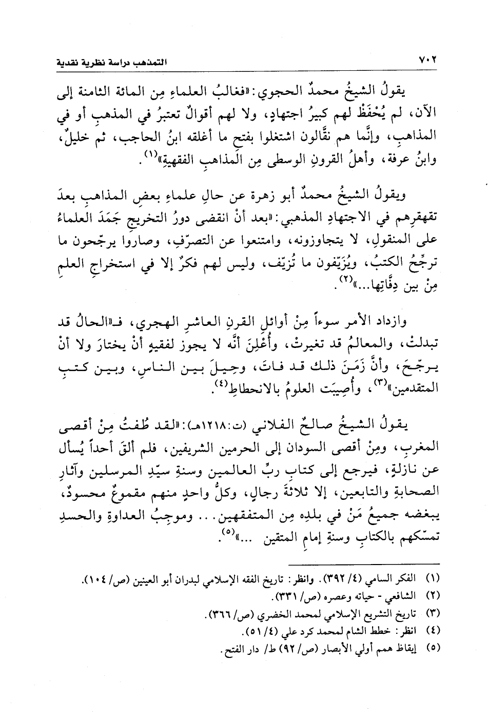ويقولُ الشيخُ محمدٌ أبو زهرة عن حالِ علماءِ بعضِ المذاهب بعدَ تقهقرِهم في الاجتهادِ المذهبي: "بعد أن انقضى دورُ التخريجِ جَمَدَ الَعلماءُ على المنقولِ، لا يتجاوزونه، وامتنعوا عن التصرّفِ، وصاروا يرجّحون ما ترجِّحُ الكتبُ، ويزَيّفون ما تُزيّف، وليس لهم فكرٌ إلا في استخراجِ العلمِ مِنْ بين دِفَّاتِها ... " (¬٢).
