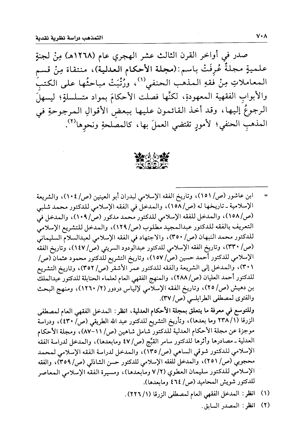 وللتوسع في معرفة ما يتعلق بمجلة الأحكام العدلية، انظر: المدخل الفقهي العام لمصطفى الزرقا (١/ ٢٣٨ وما بعدها)، وتاريخ التشريع للدكتور عبد الله الطريقي (ص / ٤٣٠)، ودراسة موجزة عن مجلة الأحكام العدلية للدكتور شامل شاهين (ص/ ١١ - ٨٧)، ومجلة الأحكام العدلية - مصادرها وأثرها للدكتور سامر القبَّج (ص/ ٤٧ وما بعدها)، والمدخل لدراسة الفقه الإسلامي للدكتور شوقي الساهي (ص/ ١٣٥)، والمدخل لدراسة الفقه الإسلامي لمحمد محجوبي (ص/ ٢٥١)، والمدخل للفقه الإسلامي للدكتور حسن الشاذلي (ص/ ٣٥٩)، والفقه الإسلامي للدكتور سليمان العطوي (٢/ ٧ وما بعدها)، ومسيرة الفقه الإسلامي المعاصر للدكتور شويش المحاميد (ص/ ٤٦٤ وما بعدها).