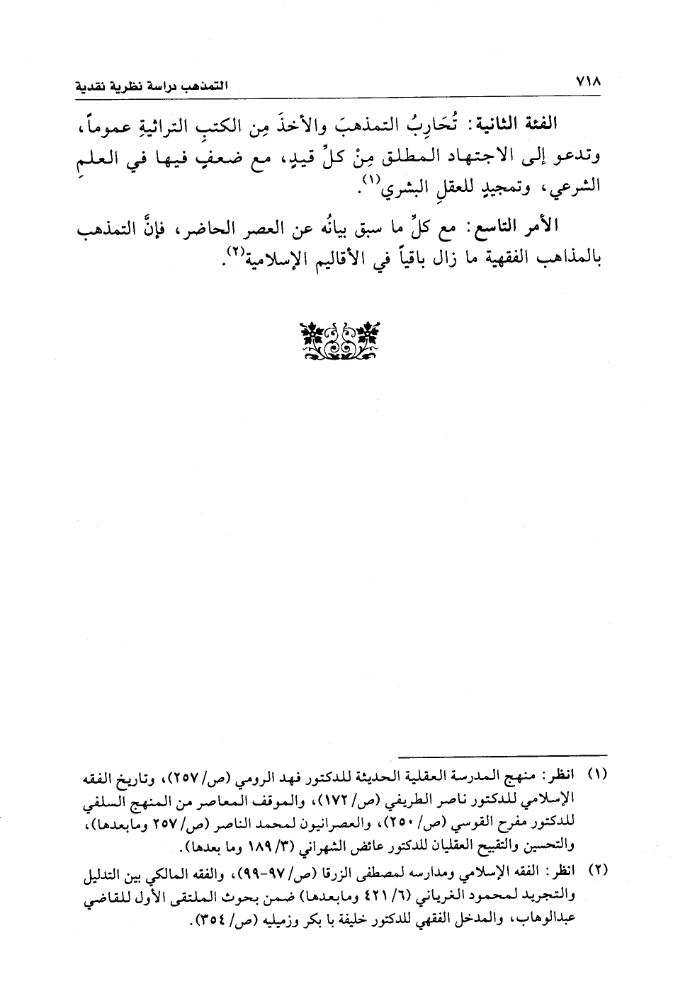 الفئة الثانية: تُحَارِبُ التمذهبَ والأخذَ مِن الكتبِ التراثيةِ عمومًا، وتدعو إلى الاجتهاد المطلق مِنْ كلِّ قيدٍ، مع ضعفٍ فيها في العلمِ الشرعي، وتمجيدٍ للعقلِ البشري (¬١).
