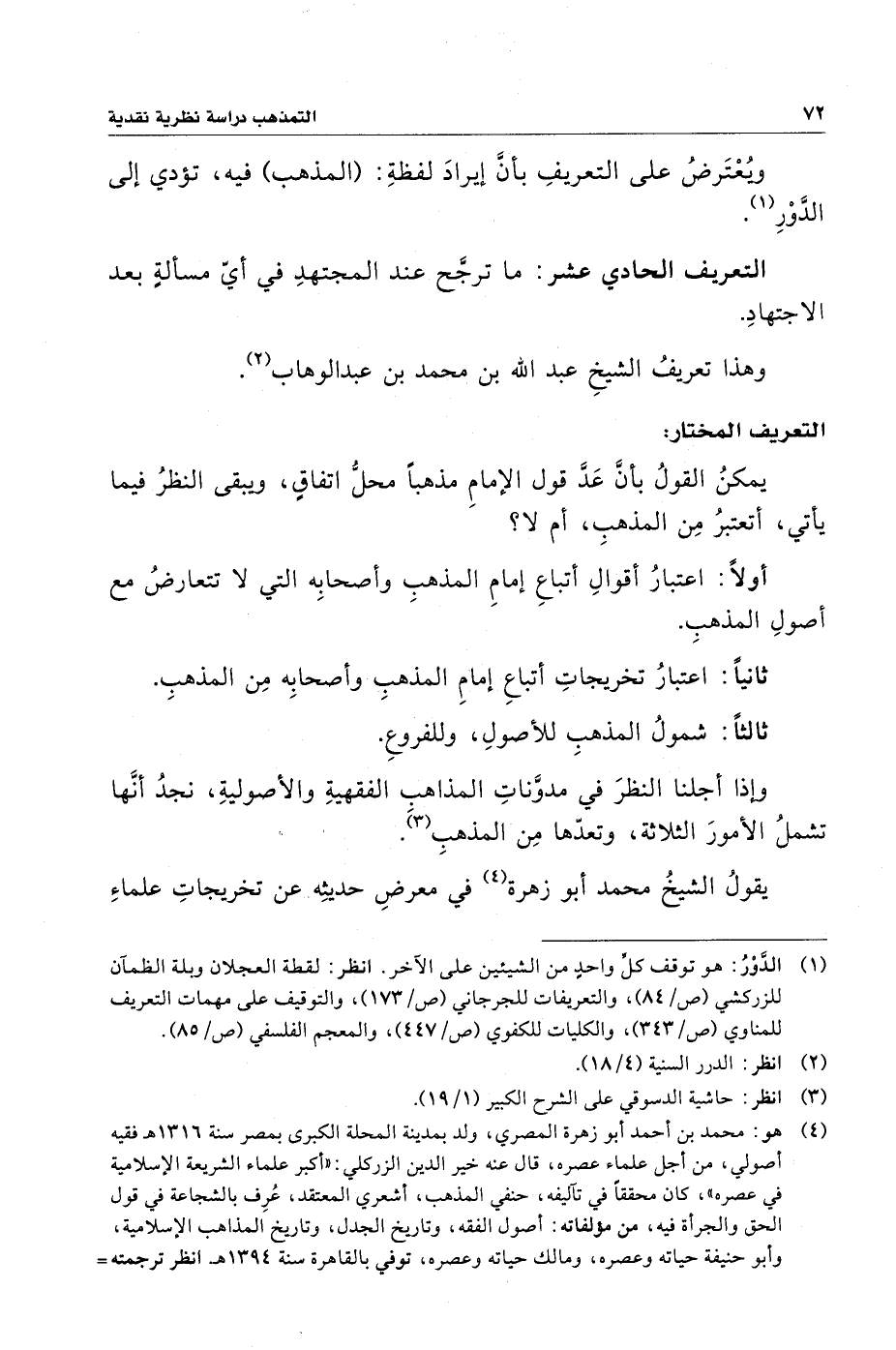 ويُعْتَرضُ على التعريفِ بأنَّ إِيرادَ لفظةِ: (المذهب) فيه، تؤدي إِلى الدَّوْرِ (¬١).