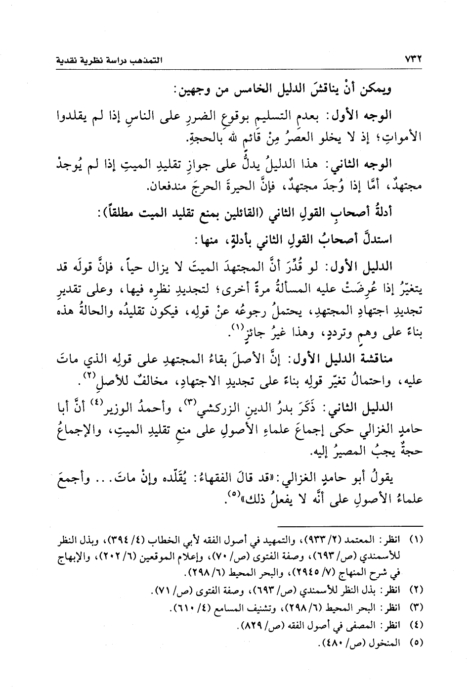 يقولُ أبو حامدٍ الغزالي: "قد قالَ الفقهاءُ: يُقَلِّده وإنْ ماتَ ... وأجمعَ علماءُ الأصولِ على أنَّه لا يفعلُ ذلك" (¬٥).