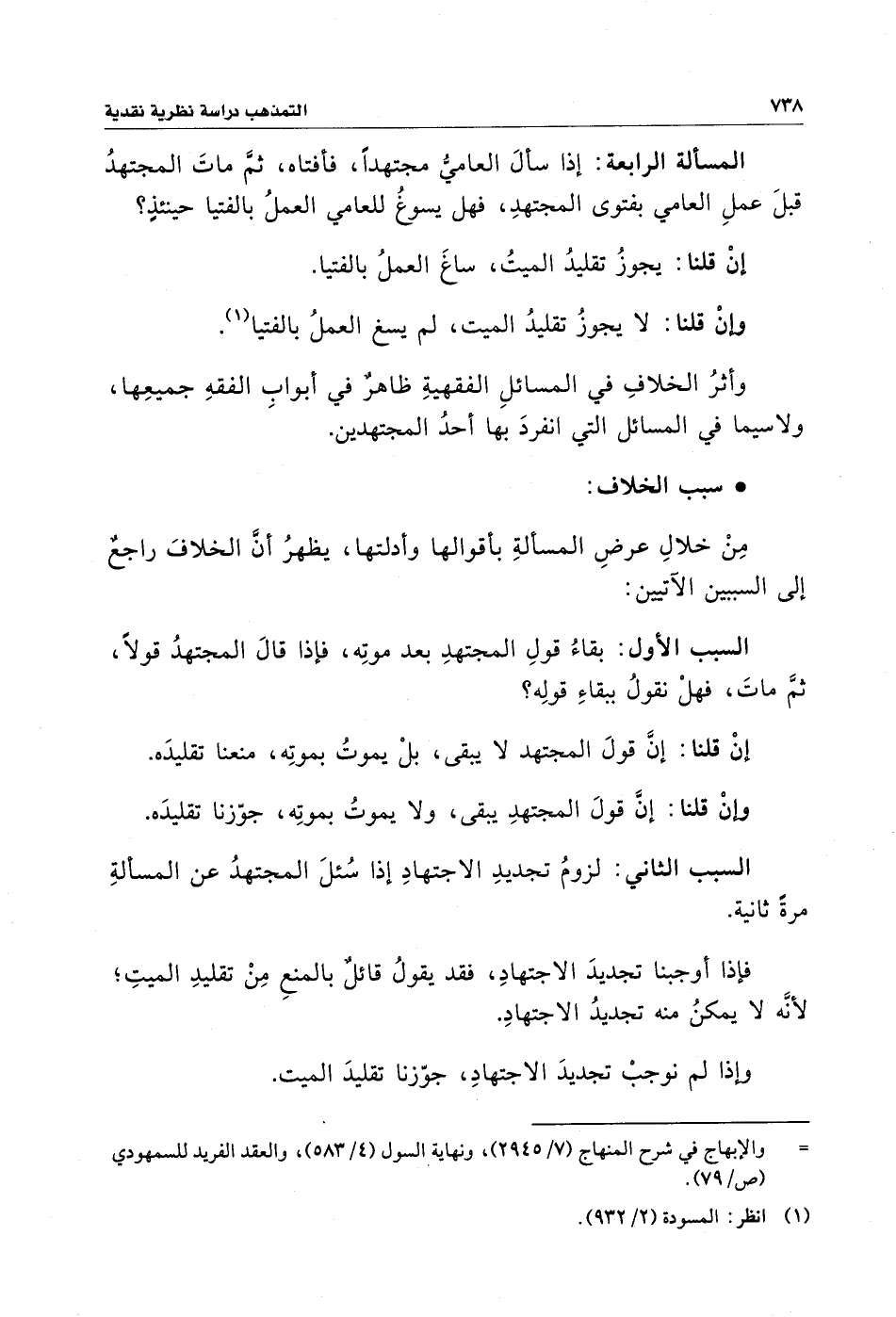 السبب الأول: بقاءُ قولِ المجتهدِ بعد موتِه، فإِذا قالَ المجتهدُ قولًا، ثُمَّ ماتَ، فهلْ نقولُ ببقاءِ قولِه؟