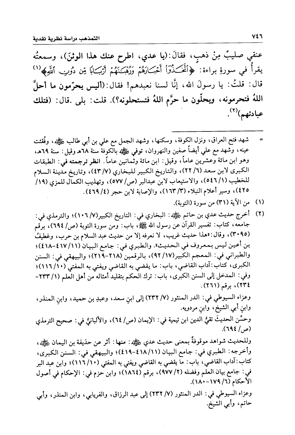 (¬٢) أخرج حديث عدي بن حاتم - رضي الله عنه -: البخاري في: التاريخ الكبير (٧/ ١٠٦)؛ والترمذي في: جامعه، كتاب: تفسير القرآن عن رسول الله - صلى الله عليه وسلم -، باب: ومن سورة التوبة (ص/ ٦٩٤)، برقم (٣٠٩٥)، وقال: "هذا حديث غريب، لا نعرفه إِلَّا من حديث عبد السَّلام بن حرب، وغطيفُ بن أعين ليس بمعروف في الحديث". والطبري في: جامع البيان (١١/ ٤١٧ - ٤١٨)؛ والطَّبراني في: المعجم الكبير (١٧/ ٩٢)، بالرقمين (٢١٨ - ٢١٩)؛ والبيهقي في: السنن الكبرى، كتاب: آداب القاضي، باب: ما يقضي به القاضي ويفتي به المفتي (١٠/ ١١٦)؛ وفي: المدخل إِلى السنن الكبرى، باب: ترك الحكم بتقليد أمثاله من أهل العلم (١/ ٢٣٣ - ٢٣٤)، برقم (٢٦١).