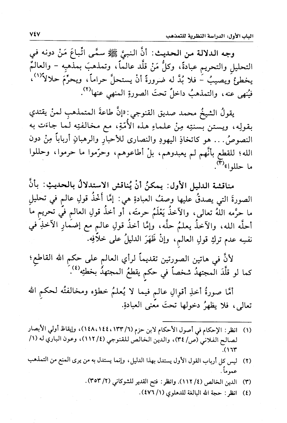 يقولُ الشيخُ محمد صديق القنوجي: "إِنَّ طاعةَ المتمذهبِ لمنْ يقتدي بقولِه، ويستن بسنتِه مِنْ علماءِ هذه الأُمّةِ، مع مخالفتِه لما جاءَت به النصوصُ ... هو كاتخاذِ اليهودِ والنصارى للأحبارِ والرهبانِ أربابًا مِنْ دون الله؛ للقطع بأنَّهم لم يعبدوهم، بلْ أطاعوهم، وحرّموا ما حرموا، وحللوا ما حللوا" (¬٣).