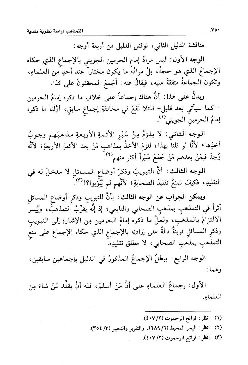 ويمكن الجواب عن الوجه الثالث: بأن للتبويبِ وذكرِ أوضاعِ المسائلِ أثرًا في التمذهبِ بمذهب الصحابي والتابعي؛ إِذ إِنَّه يقرِّبُ التمذهبَ، ويُيسر الالتزامَ بالمذهبِ، ولعَلَّ ما ذكره إِمامُ الحرمين مِن الإِشارةِ إِلى التبويبِ وذكرِ المسائلِ قرينةٌ دالةٌ على إِرادتِه بالإِجماعِ الَّذي حكاه الإِجماع على منعِ التمذهبِ بمذهبِ الصحابي، لا مطلق تقليدِه.