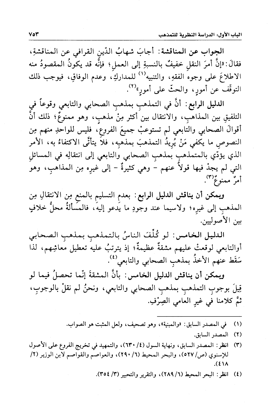 ويمكن أن يناقش الدليل الخامس: بأنَّ المشقةَ إِنَّما تحصلُ فيما لو قِيلَ بوجوبِ التمذهبِ بمذهبِ الصحابي والتابعي، ونحنُ لم نقلْ بالوجوبِ، ثمَّ كلامنا في غيرِ العامي الصِرْفِ.