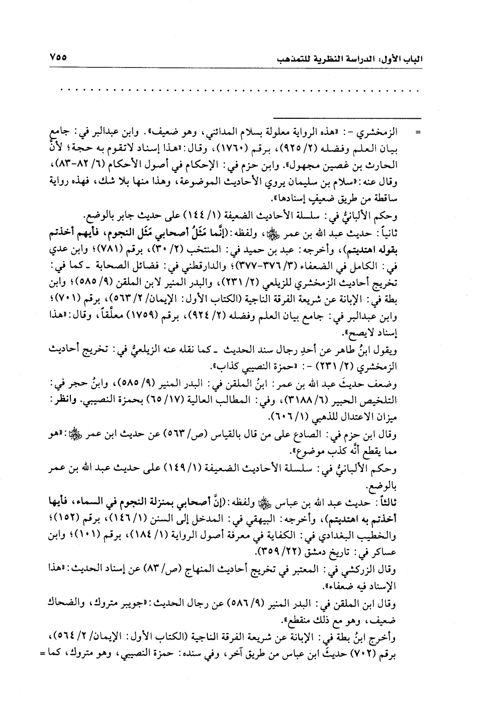 ثانيًا: حديث عبد الله بن عمر - رضي الله عنهما -، ولفظه: (إِنَّما مَثَلُ أصحابي مَثَل النجوم، فأيهم أخذتم بقوله اهتديتم)، وأخرجه: عبد بن حميد في: المنتخب (٢/ ٣٠)، برقم (٧٨١)؛ وابن عدي في: الكامل في الضعفاء (٣/ ٣٧٦ - ٣٧٧)؛ والدارقطني في: فضائل الصحابة - كما في: تخريج أحاديث الزَّمخشري للزيلعي (٢/ ٢٣١)، والبدر المنير لابن الملقن (٩/ ٥٨٥)؛ وابن بطة في: الإِبانة عن شريعة الفرقة الناجية (الكتاب الأول: الإِيمان/ ٢/ ٥٦٣)، برقم (٧٠١)؛ وابن عبد البر في: جامع بيان العلم وفضله (٢/ ٩٢٤)، برقم (١٧٥٩) معلَّقًا، وقال: "هذا إِسناد لا يصح".