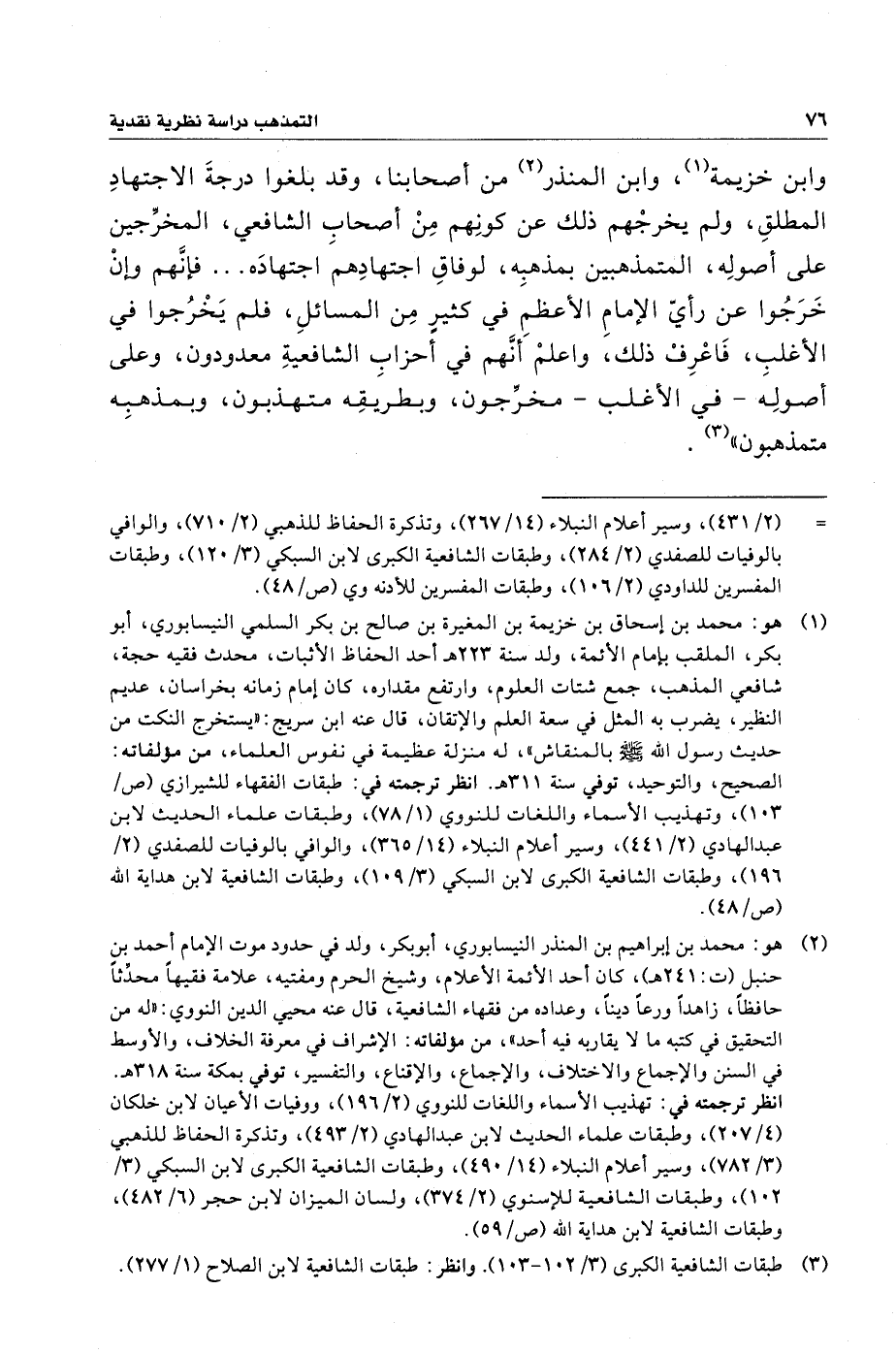 وابن خزيمة (¬١)، وابن المنذر (¬٢) من أصحابنا، وقد بلغوا درجةَ الاجتهادِ المطلقِ، ولم يخرجْهم ذلك عن كونِهم مِنْ أصحابِ الشَّافعي، المخرِّجين على أصولِه، المتمذهبين بمذهبِه، لوفاقِ اجتهادِهم اجتهادَه ... فإِنَّهم وإِنْ خَرَجُوا عن رأيّ الإِمامِ الأعظمِ في كثيرِ مِن المسائلِ، فلم يَخْرُجوا في الأغلبِ، فَاعْرِفْ ذلك، واعلمْ أنَّهم في أحزابِ الشافعيةِ معدودون، وعلى أصولِه - في الأغلب - مخرِّجون، وبطريقِه متهذبون، وبمذهبِه متمذهبون" (¬٣).