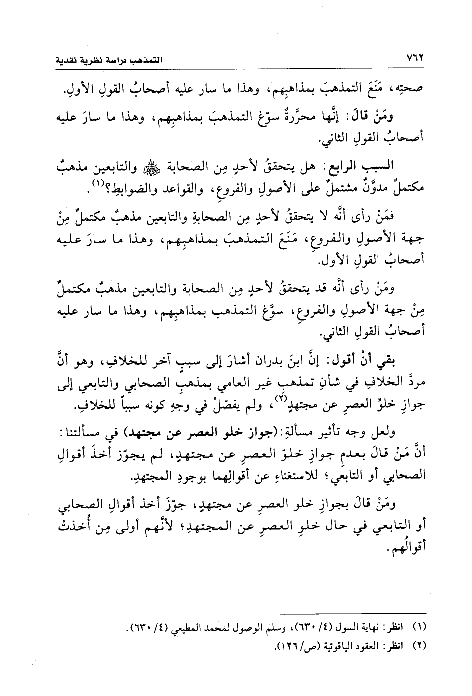 بقي أنْ أقول: إِنَّ ابنَ بدران أشارَ إِلى سبب آخر للخلافِ، وهو أنَّ مرد الخلافِ في شأنِ تمذهب غير العامي بمذهبَ الصحابي والتابعي إِلى جوازِ خلوِّ العصرِ عن مجتهدٍ (¬٢)، ولم يفضلْ في وجهِ كونه سببًا للخلافِ.