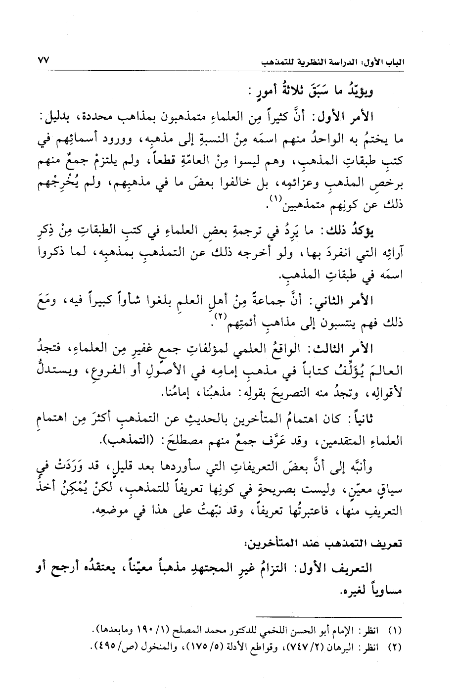 وأنبَّه إِلى أن بعضَ التعريفاتِ الَّتي سأوردها بعد قليلٍ، قد وَرَدَتْ في سياقٍ معيّنٍ، وليست بصريحةٍ في كونِها تعريفًا للتمذهبِ، لكنْ يُمْكِنُ أخذ التعريفِ منها، فاعتبرتُها تعريفًا، وقد نبّهتُ على هذا في موضعِه.