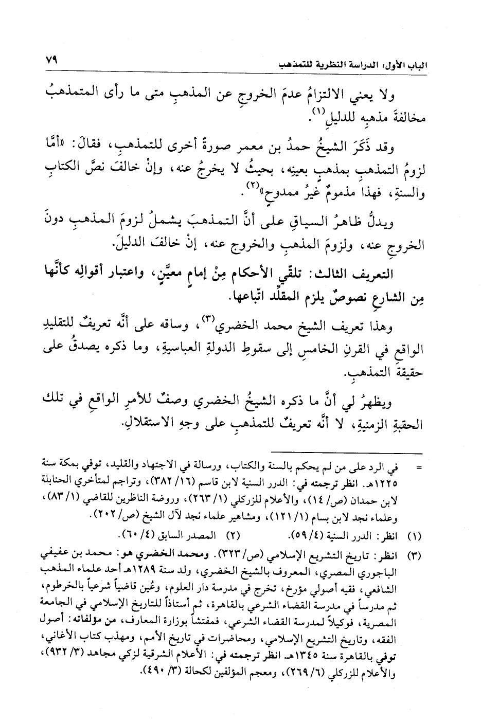 وهذا تعريف الشَّيخ محمد الخضري (¬٣)، وساقه على أنَّه تعريفٌ للتقليدِ الواقعِ في القرنِ الخامسِ إِلى سقوطِ الدولةِ العبَّاسيةِ، وما ذكره يصدق على حقيقة التمذهبِ.