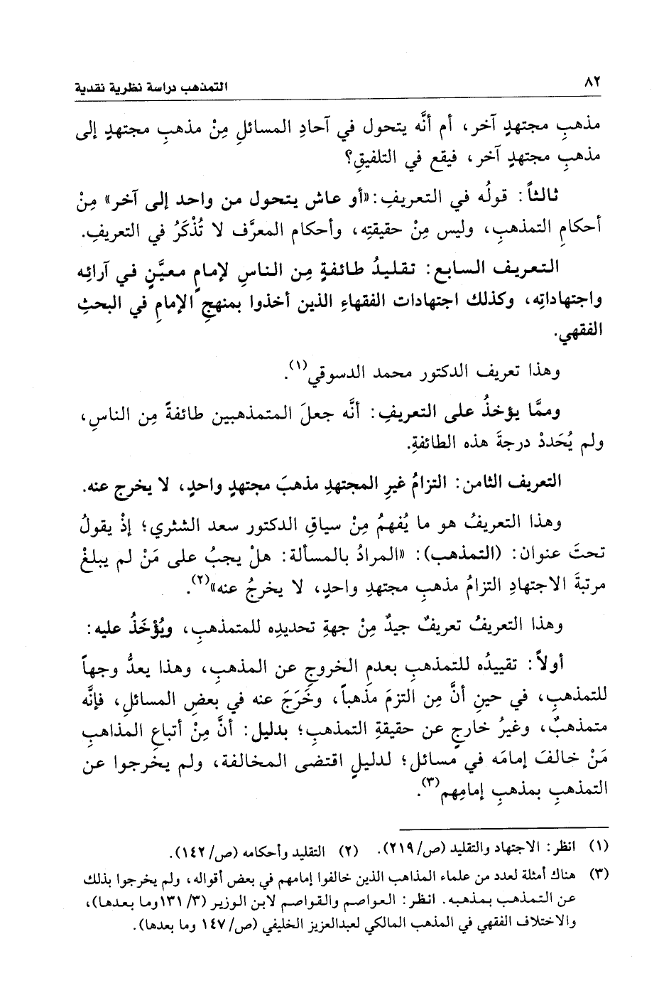 وهذا التعريفُ هو ما يُفهمُ مِنْ سياقِ الدكتور سعد الشثري؛ إِذْ يقولُ تحتَ عنوان: (التمذهب): "المرادُ بالمسألة: هلْ يجبُ على مَنْ لم يبلغْ مرتبةَ الاجتهادِ التزامُ مذهبِ مجتهدِ واحدٍ، لا يخرجُ عنه" (¬٢).