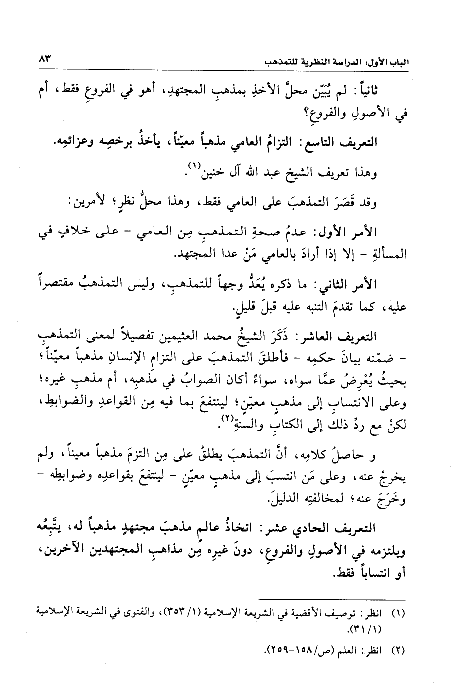 وحاصلُ كلامِه، أنَّ التمذهبَ يطلقُ على مِن التزمَ مذهبًا معينًا، ولم يخرجْ عنه، وعلى مَن انتسبَ إِلى مذهبٍ معيّنٍ - لينتفعَ بقواعدِه وضوابطِه - وخَرَجَ عنه؛ لمخالفتِه الدليلَ.