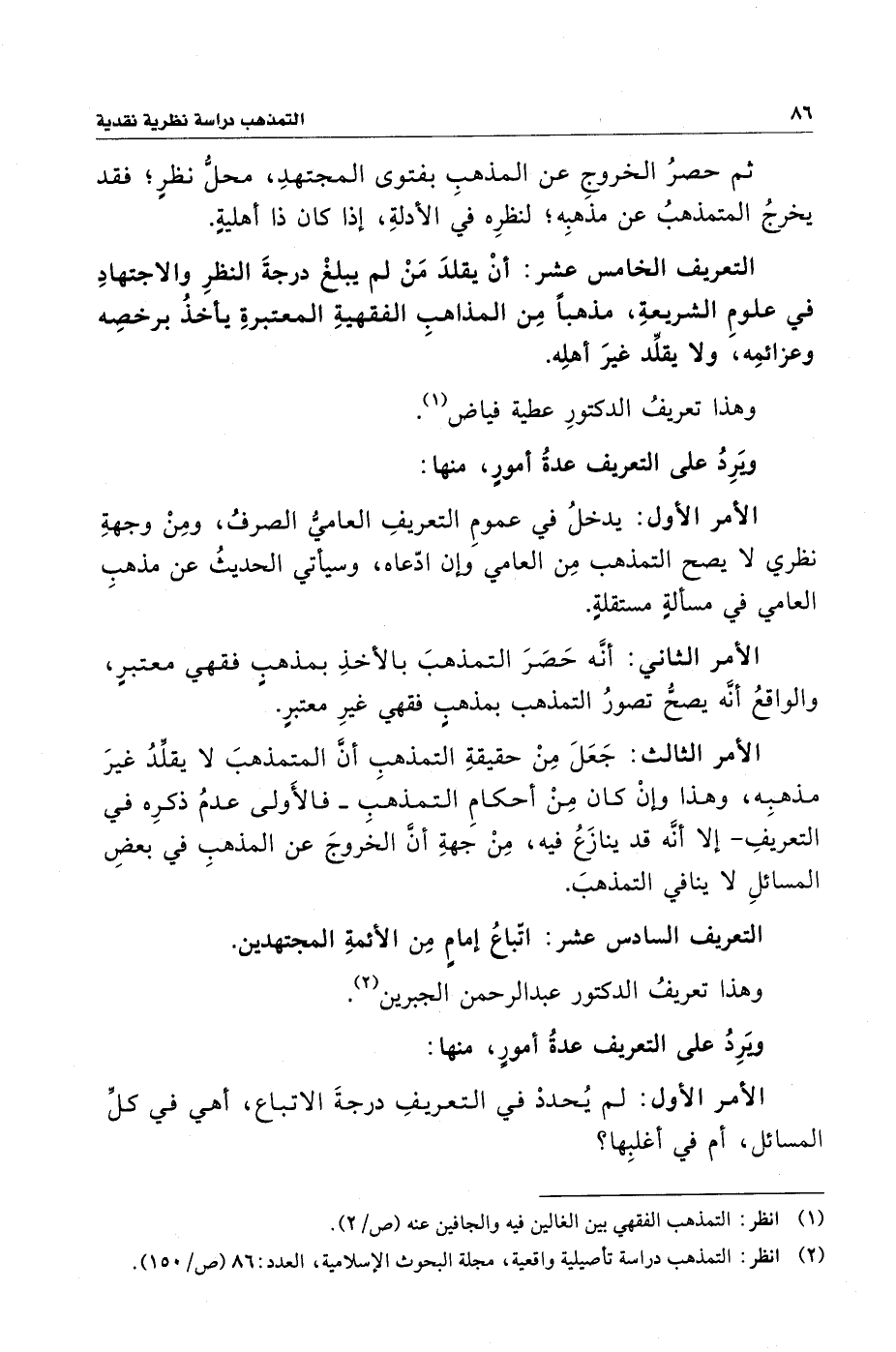 (¬٢) انظر: التمذهب دراسة تأصيلية واقعية، مجلة البحوث الإِسلامية، العدد: ٨٦ (ص/ ١٥٠).