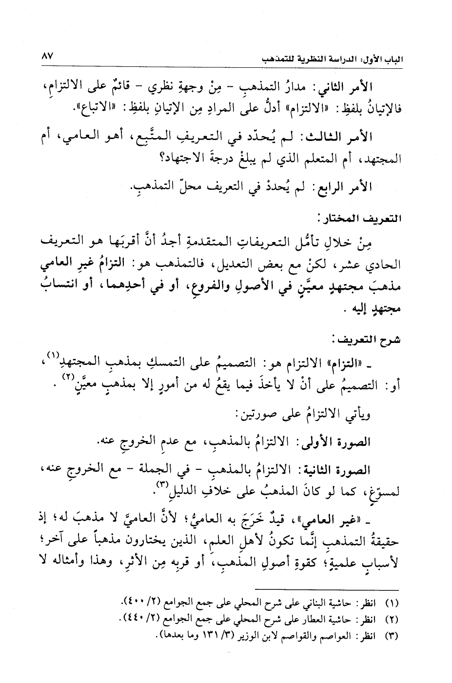 - "التزام" الالتزام هو: التصميمُ على التمسكِ بمذهبِ المجتهدِ (¬١)، أو: التصميمُ على أنْ لا يأخذَ فيما يقعُ له من أمورٍ إِلَّا بمذهبٍ معيَّنٍ (¬٢).