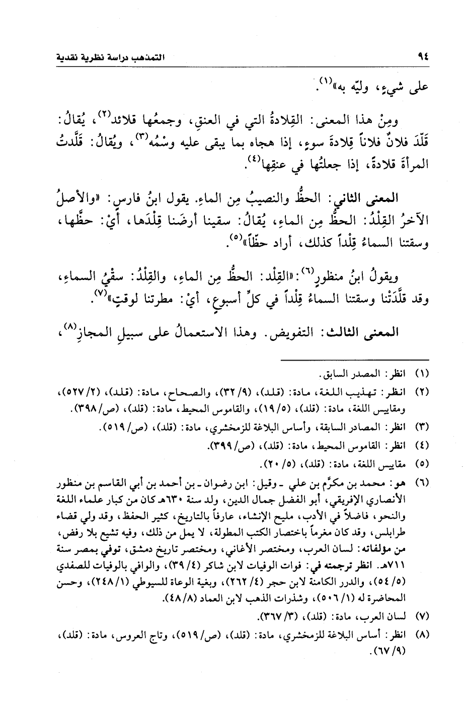 (¬٨) انظر: أساس البلاغة للزمخشري، مادة: (قلد)، (ص/ ٥١٩)، وتاج العروس، مادة: (قلد)، (٩/ ٦٧).
