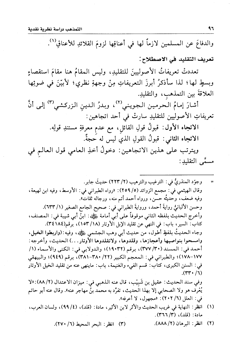 أشارَ إمامُ الحرمين الجويني (¬٢)، وبدرُ الدينِ الزركشي (¬٣) إلى أنَّ تعريفاتِ الأصوليين للتقليدِ سارتْ في أحد اتجاهين: