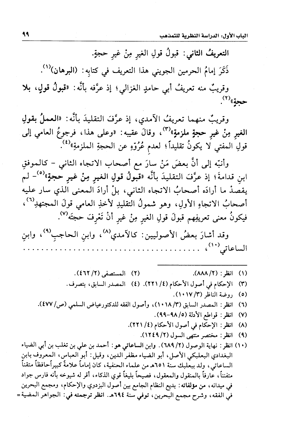 وأنبّه إلى أنَّ بعضَ مَنْ سارَ مع أصحاب الاتجاه الثاني - كالموفقِ ابنِ قدامةَ؛ إذ عرَّفَ التقليدَ بأنَّه "قبولُ قولِ الغيرِ مِنْ غيرِ حجةٍ" (¬٥) - لم يقصدْ ما أرادَه أصحابُ الاتجاه الثاني، بلْ أرادَ المعنى الذي سار عليه أصحابُ الاتجاهِ الأولِ، وهو شمولُ التقليدِ لأخذِ العامي قولَ المجتهدِ (¬٦)، فيكونُ معنى تعريفِهم قبولَ قولِ الغيرِ مِنْ غيرِ أنْ تَعْرِفَ حجتَه (¬٧).