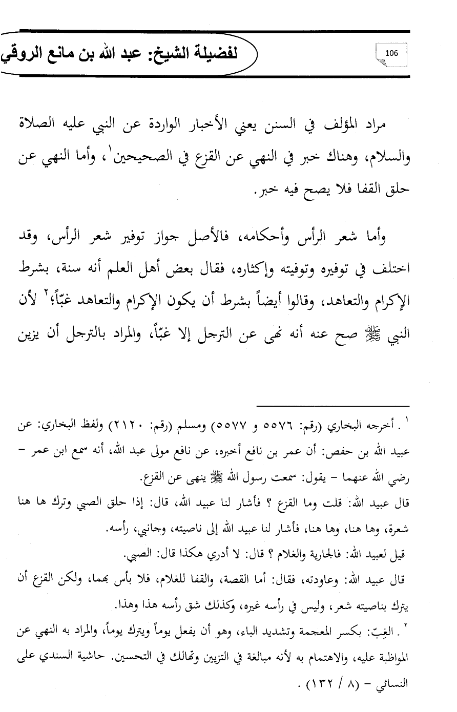مراد المؤلف في السنن يعني الأخبار الواردة عن النبي عليه الصلاة والسلام, وهناك خبر في النهي عن القزع في الصحيحين (¬1) , وأما النهي عن حلق القفا فلا يصح فيه خبر.
