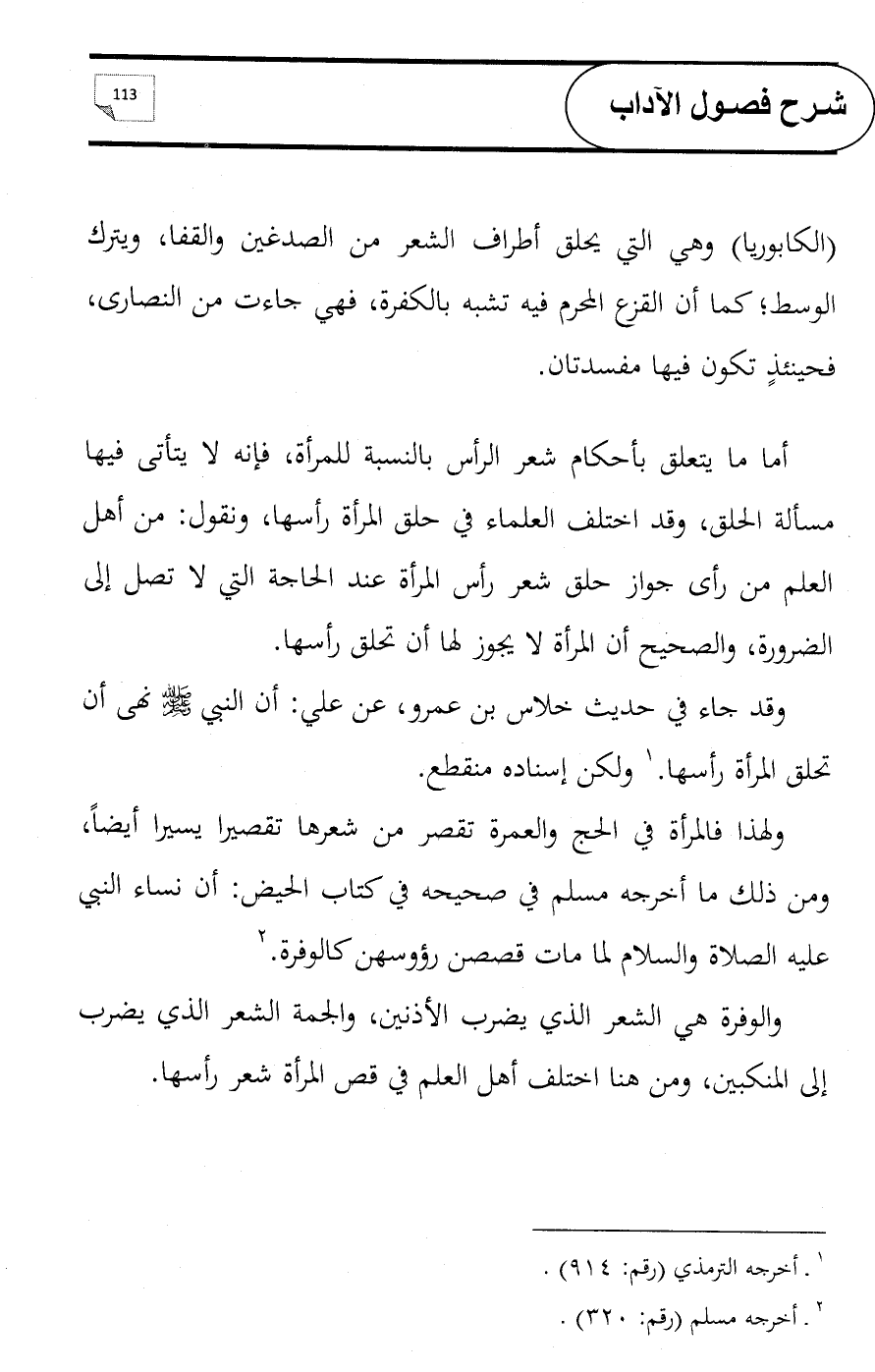 ولهذا فالمرأة في الحج والعمرة تقصر من شعرها تقصيرا يسيرا أيضاً, ومن ذلك ما أخرجه مسلم في صحيحه في كتاب الحيض: أن نساء النبي عليه الصلاة والسلام لما مات قصصن رؤوسهن كالوفرة. (¬2)