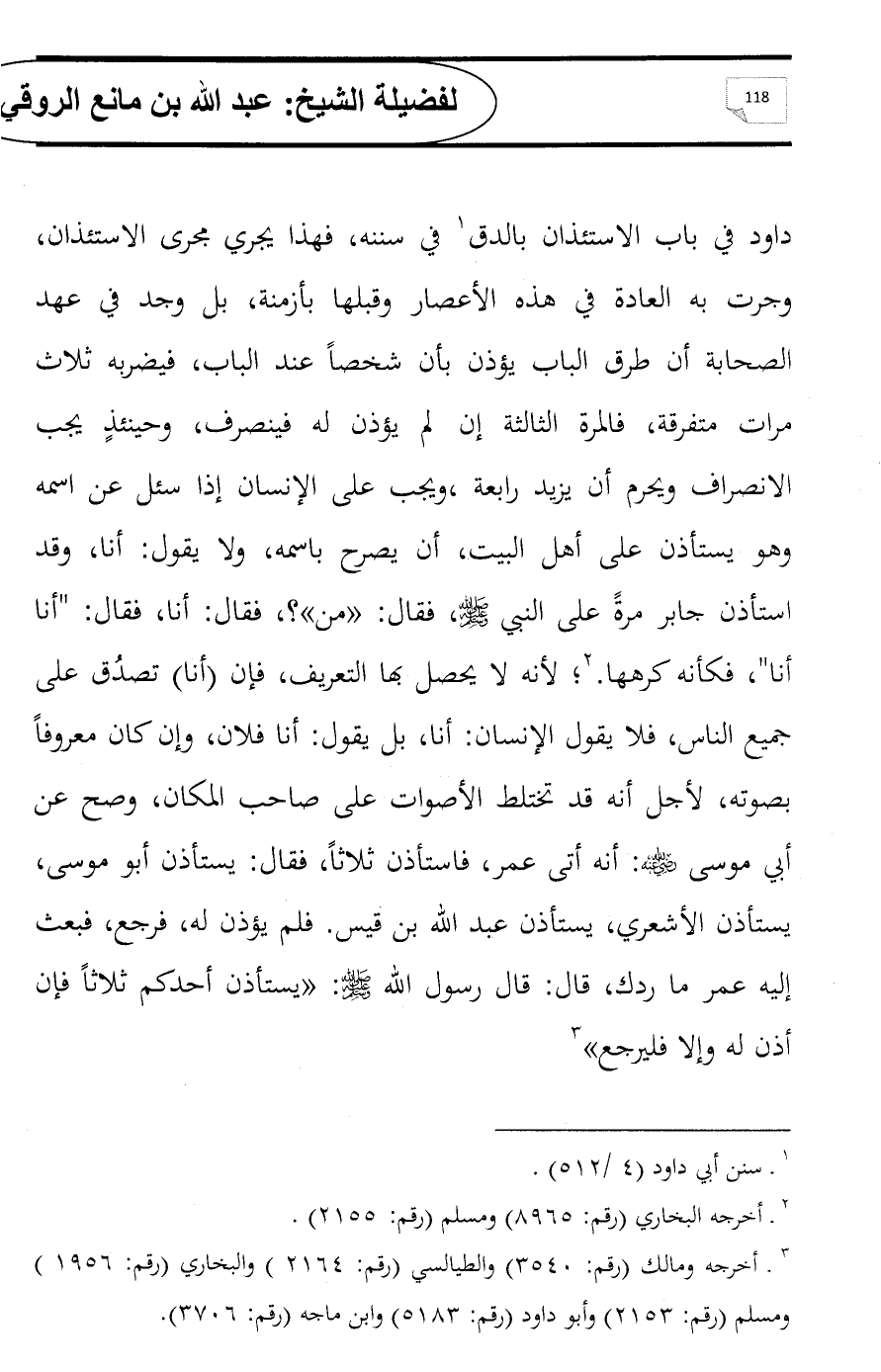 داود في باب الاستئذان بالدق (¬1) في سننه, فهذا يجري مجرى الاستئذان, وجرت به العادة في هذه الأعصار وقبلها بأزمنة, بل وجد في عهد الصحابة أن طرق الباب يؤذن بأن شخصاً عند الباب, فيضربه ثلاث مرات متفرقة, فالمرة الثالثة إن لم يؤذن له فينصرف, وحينئذٍ يجب الانصراف ويحرم أن يزيد رابعة ,ويجب على الإنسان إذا سئل عن اسمه وهو يستأذن على أهل البيت، أن يصرح باسمه, ولا يقول: أنا, وقد استأذن جابر مرةً على النبي - صلى الله عليه وسلم -، فقال: «من»؟ , فقال: أنا, فقال: "أنا أنا", فكأنه كرهها. (¬2)؛ لأنه لا يحصل بها التعريف, فإن (أنا) تصدُق على جميع الناس، فلا يقول الإنسان: أنا, بل يقول: أنا فلان, وإن كان معروفاً بصوته، لأجل أنه قد تختلط الأصوات على صاحب المكان، وصح عن أبي موسى - رضي الله عنه -: أنه أتى عمر، فاستأذن ثلاثاً، فقال: يستأذن أبو موسى، يستأذن الأشعري، يستأذن عبد الله بن قيس. فلم يؤذن له، فرجع، فبعث إليه عمر ما ردك، قال: قال رسول الله - صلى الله عليه وسلم -: «يستأذن أحدكم ثلاثاً فإن أذن له وإلا فليرجع» (¬3)