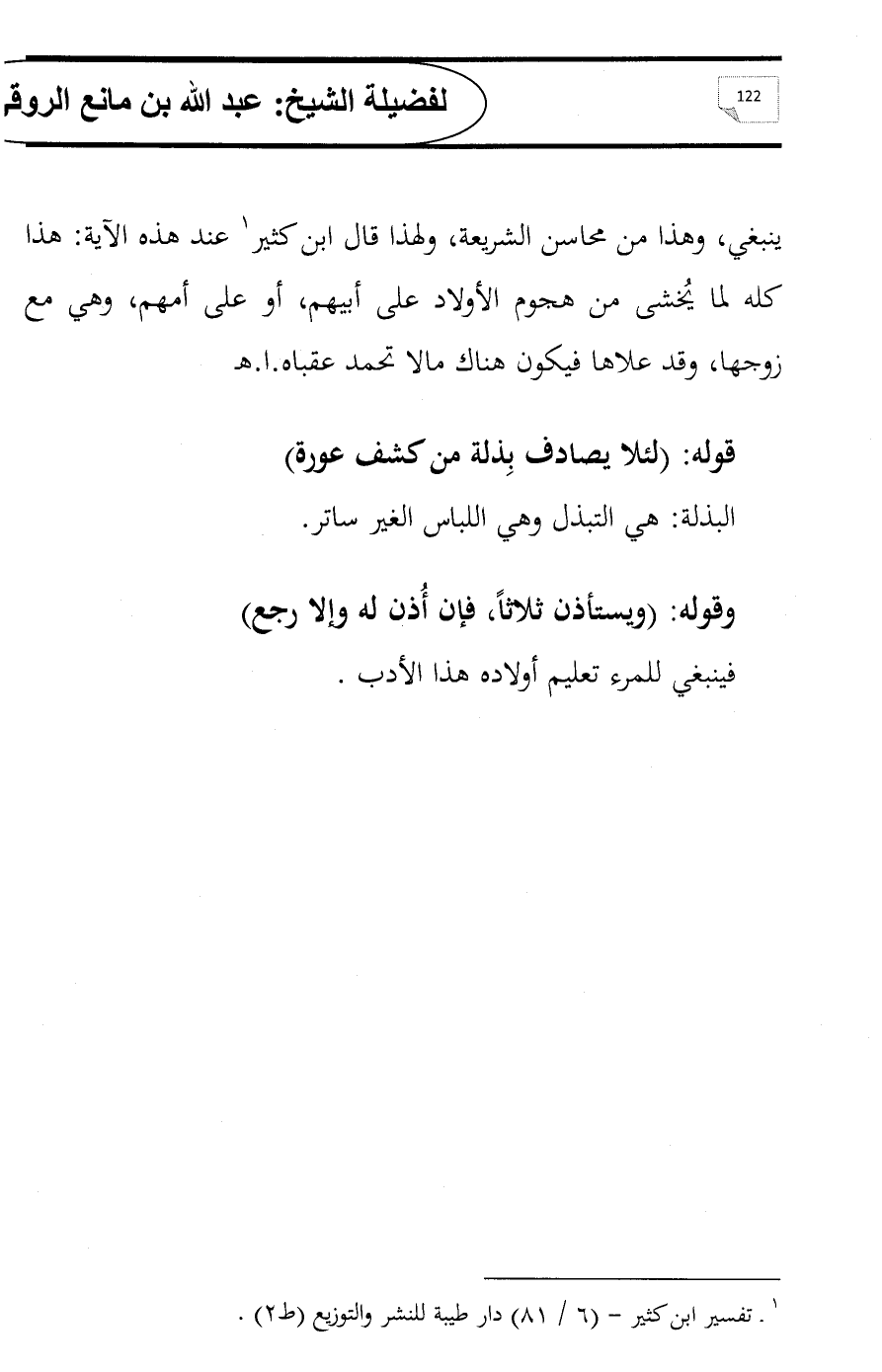 ينبغي, وهذا من محاسن الشريعة, ولهذا قال ابن كثير (¬1) عند هذه الآية: هذا كله لما يُخشى من هجوم الأولاد على أبيهم، أو على أمهم، وهي مع زوجها، وقد علاها فيكون هناك مالا تحمد عقباه. ا. هـ