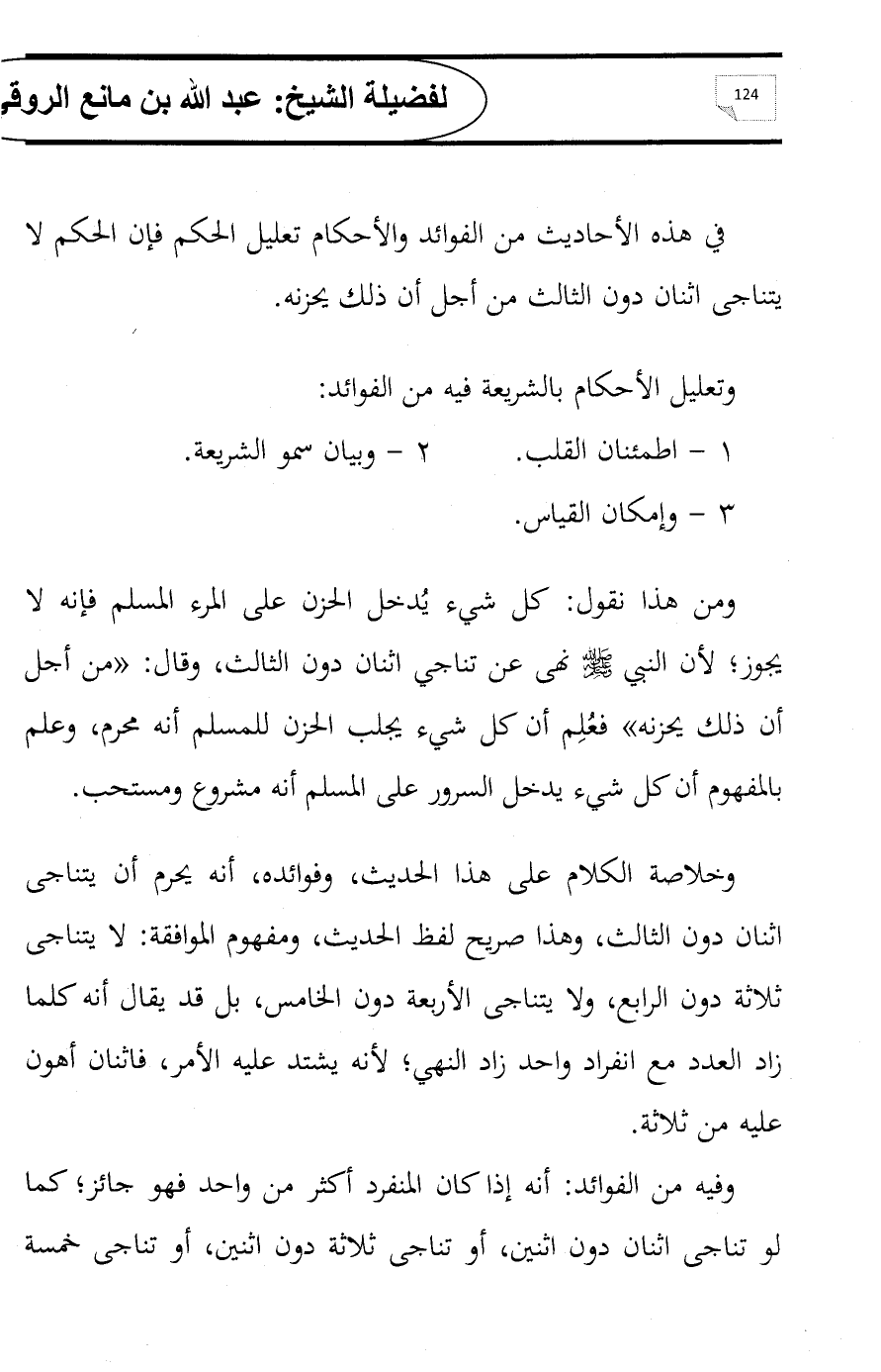 ومن هذا نقول: كل شيء يُدخل الحزن على المرء المسلم فإنه لا يجوز؛ لأن النبي - صلى الله عليه وسلم - نهى عن تناجي اثنان دون الثالث، وقال: «من أجل أن ذلك يحزنه» فعُلِم أن كل شيء يجلب الحزن للمسلم أنه محرم, وعلم بالمفهوم أن كل شيء يدخل السرور على المسلم أنه مشروع ومستحب.