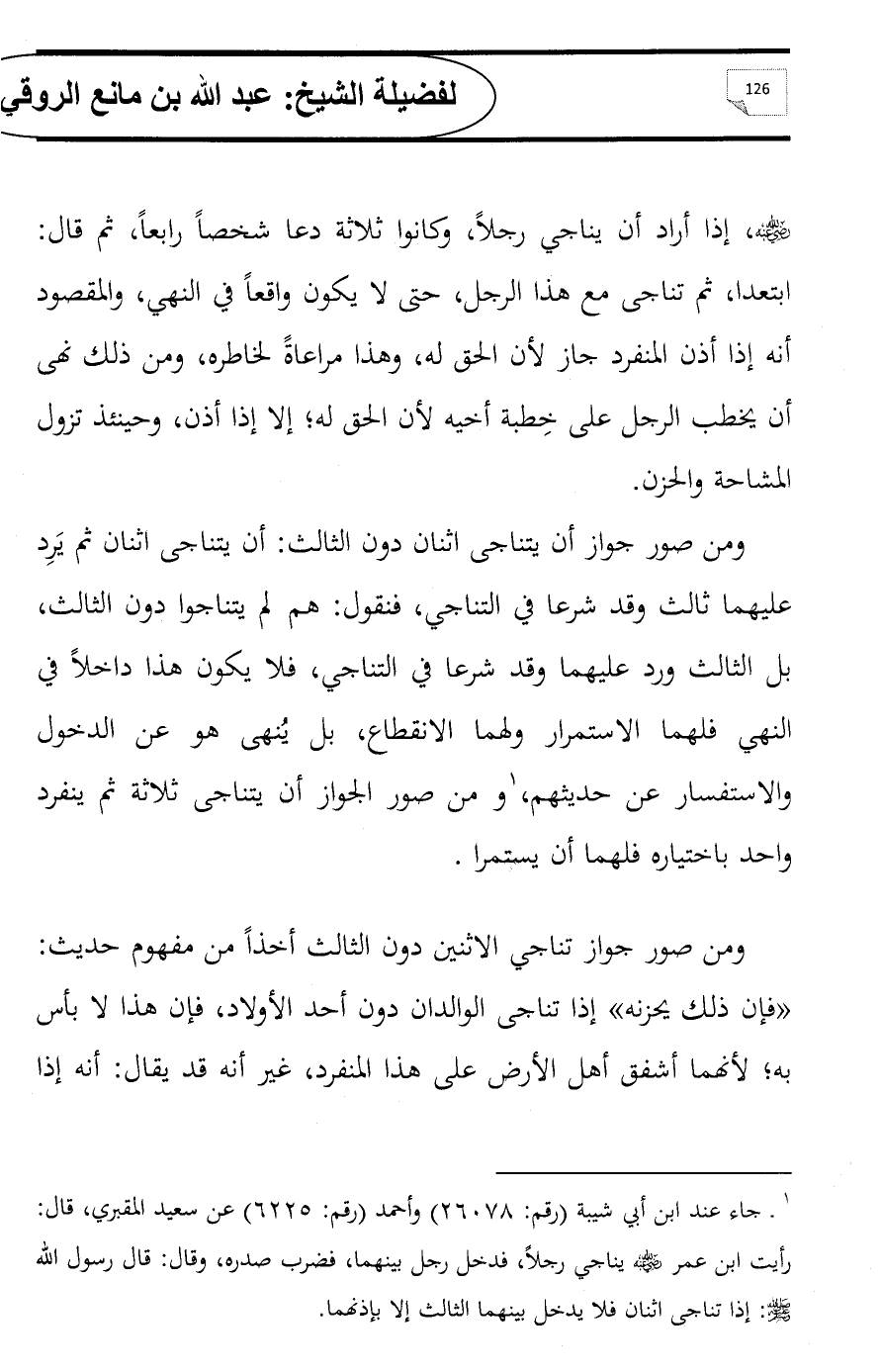 (¬1) جاء عند ابن أبي شيبة (رقم: 26078) وأحمد (رقم: 6225) عن سعيد المقبري، قال: رأيت ابن عمر - رضي الله عنه - يناجي رجلاً، فدخل رجل بينهما، فضرب صدره، وقال: قال رسول الله - صلى الله عليه وسلم -: إذا تناجى اثنان فلا يدخل بينهما الثالث إلا بإذنهما.