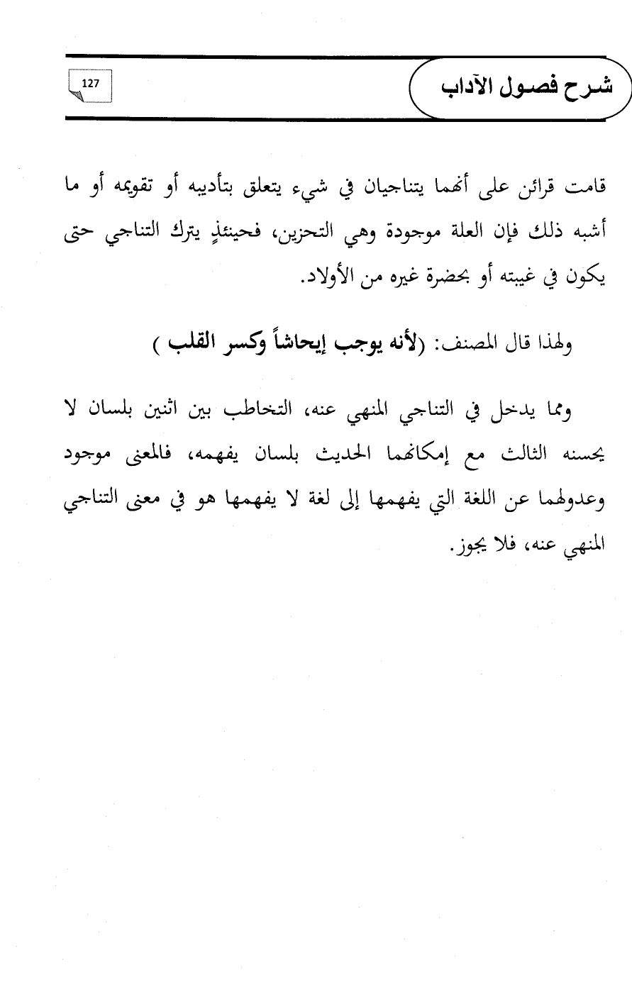 ومما يدخل في التناجي المنهي عنه، التخاطب بين اثنين بلسان لا يحسنه الثالث مع إمكانهما الحديث بلسان يفهمه، فالمعنى موجود وعدولهما عن اللغة التي يفهمها إلى لغة لا يفهمها هو في معنى التناجي المنهي عنه، فلا يجوز.