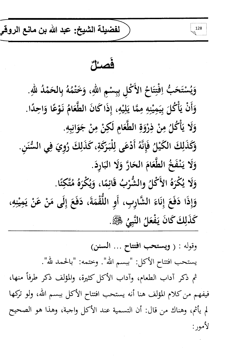 وَيُسْتَحَبُّ اِفْتِتَاحُ الأَكْلِ بِبِسْمِ اللهِ، وَخَتْمُهُ بِالحَمْدُ للهِ.